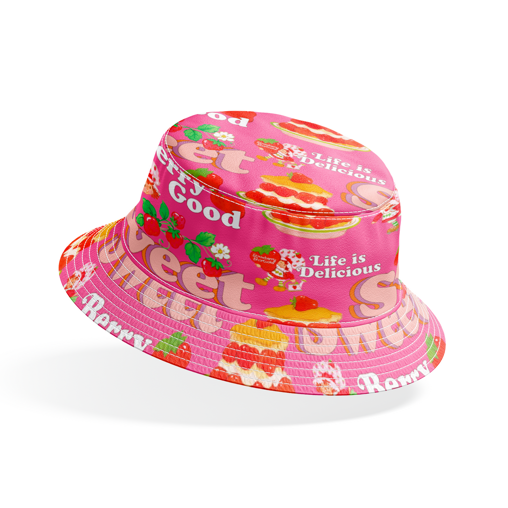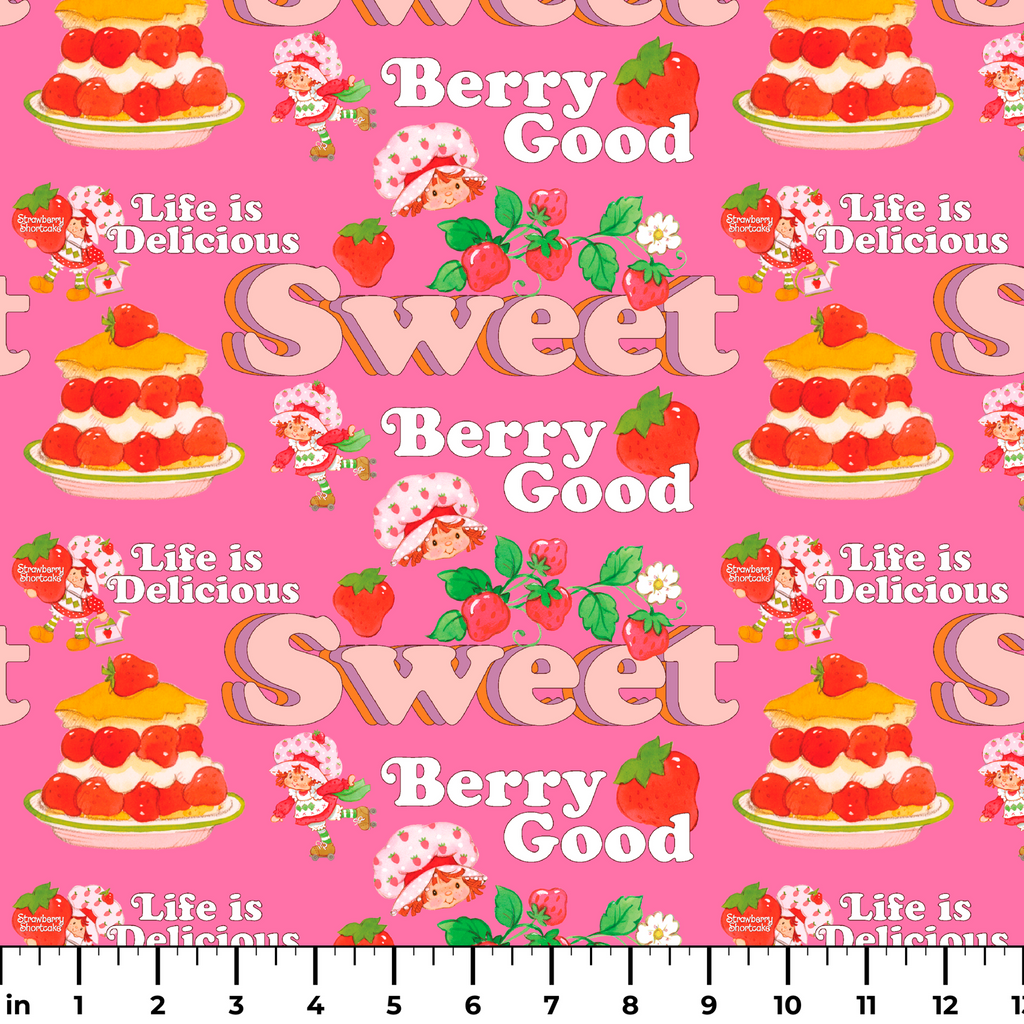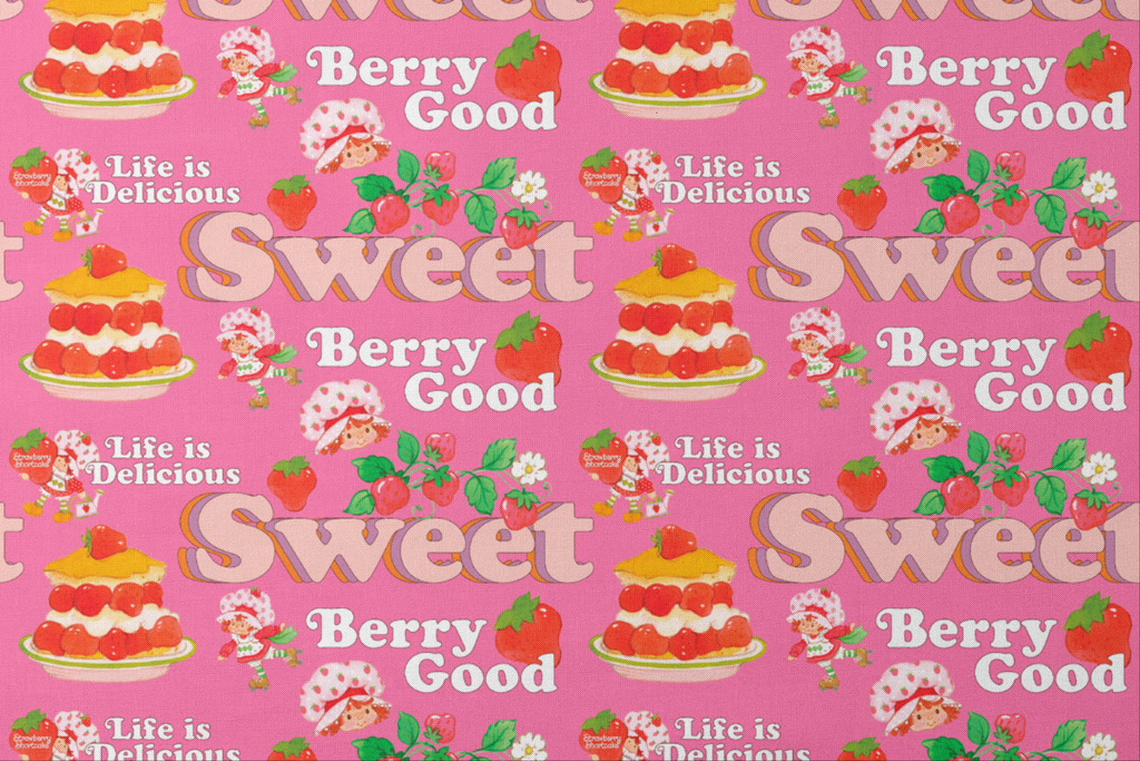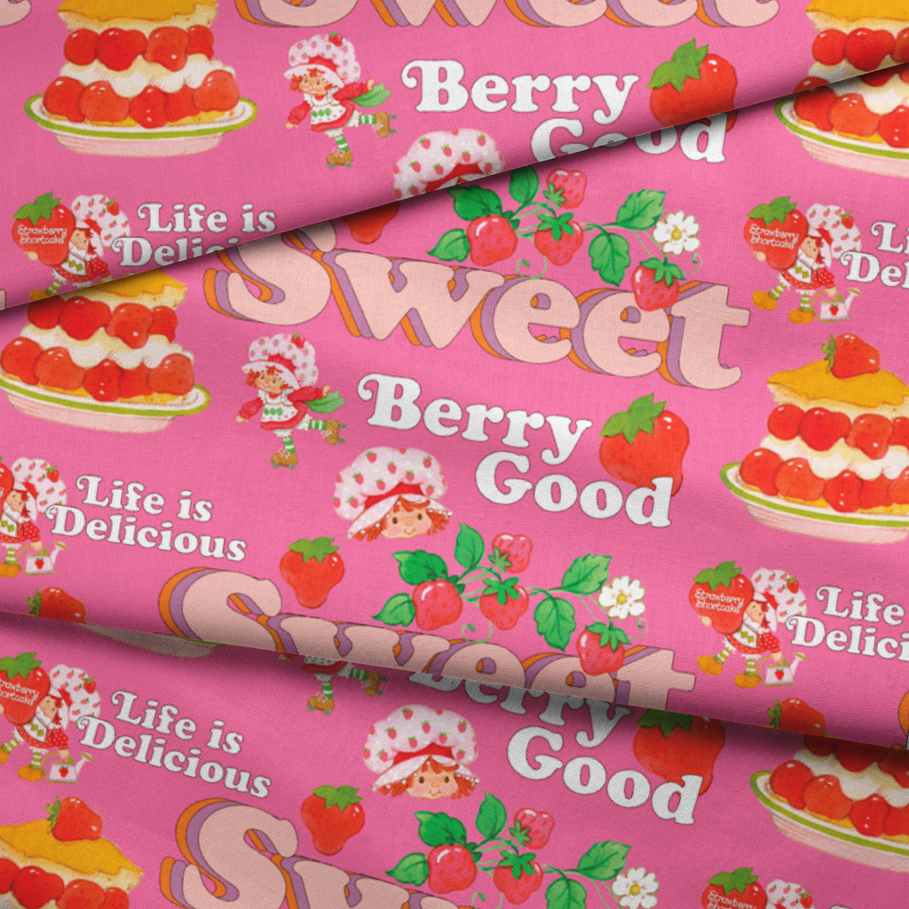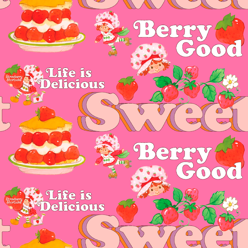 This sweet Strawberry Shortcake pattern features desserts, cute berry illustrations, and the iconic Strawberry Shortcake on a vibrant pink background with playful phrases like "Berry Good" and "Life is Delicious."