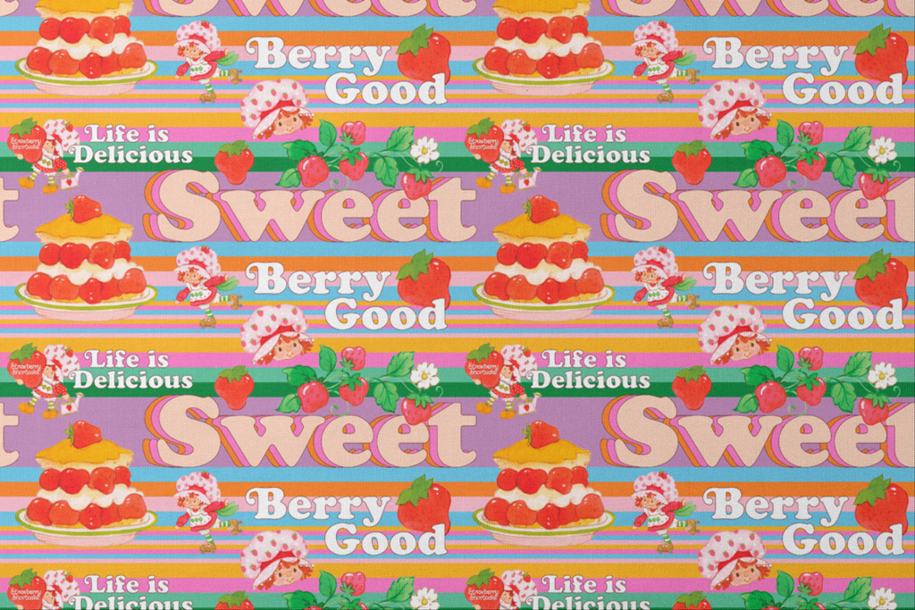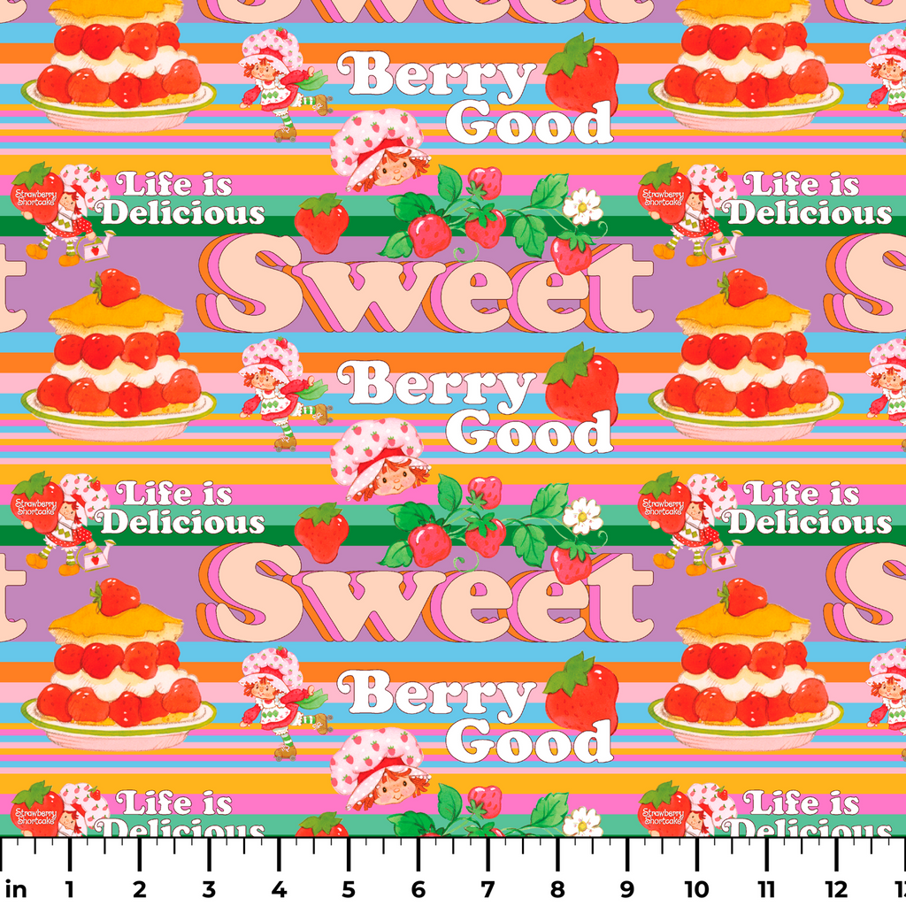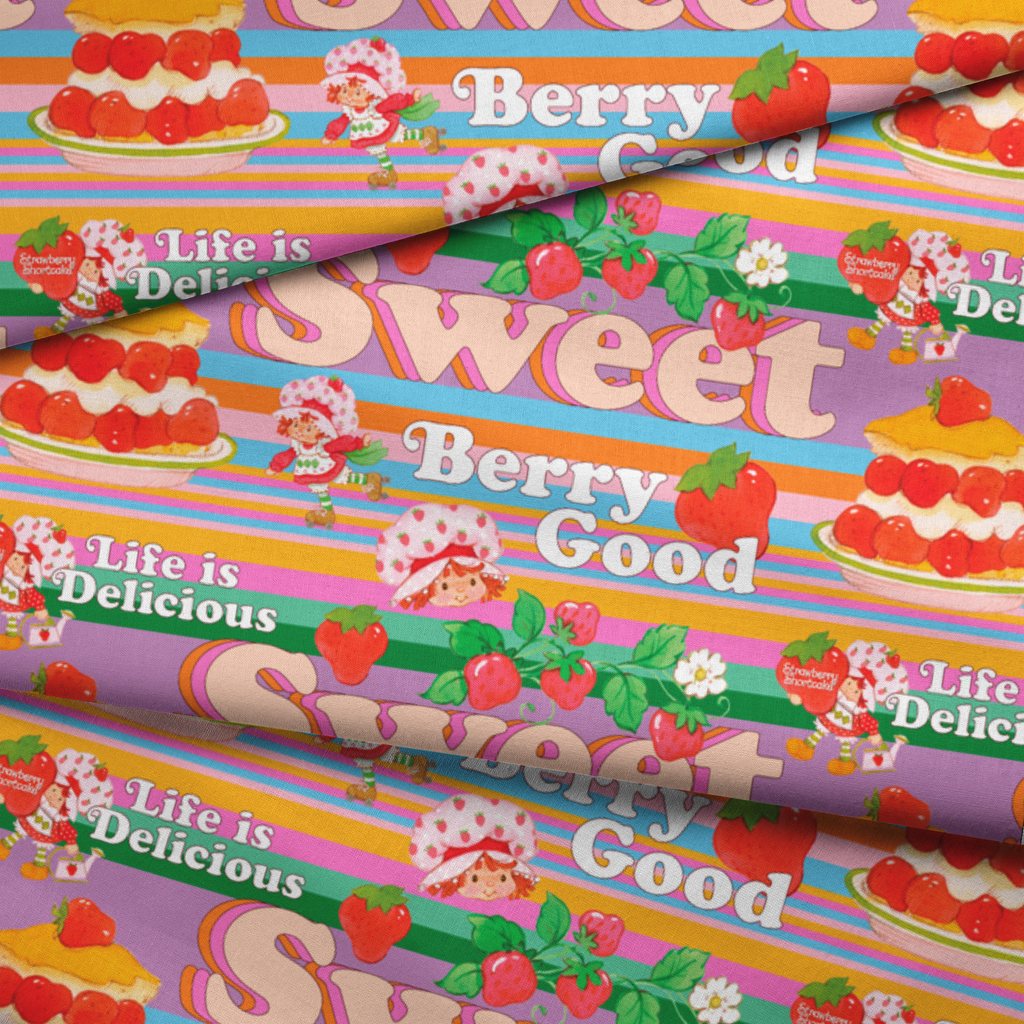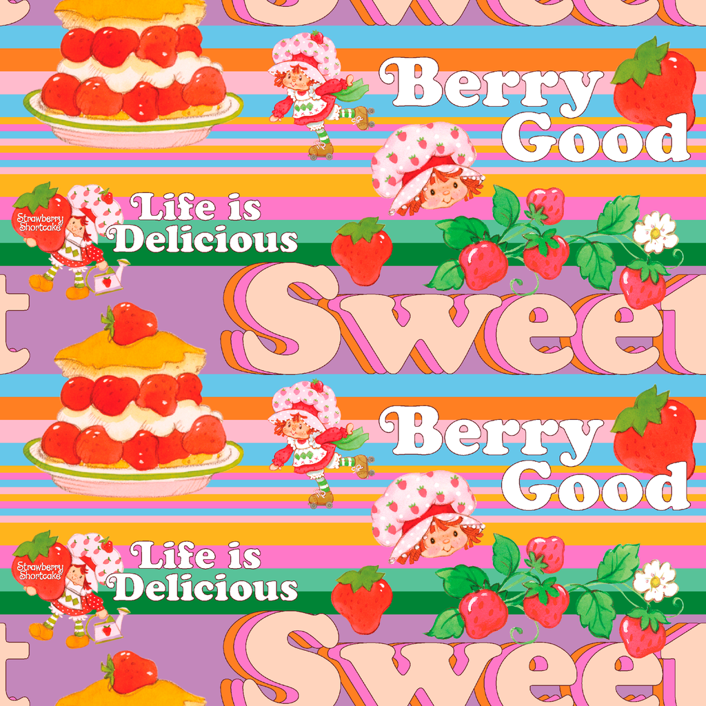 This sweet Strawberry Shortcake pattern features desserts, cute berry illustrations, and the iconic Strawberry Shortcake on a vibrant multi stripes background with playful phrases like "Berry Good" and "Life is Delicious."
