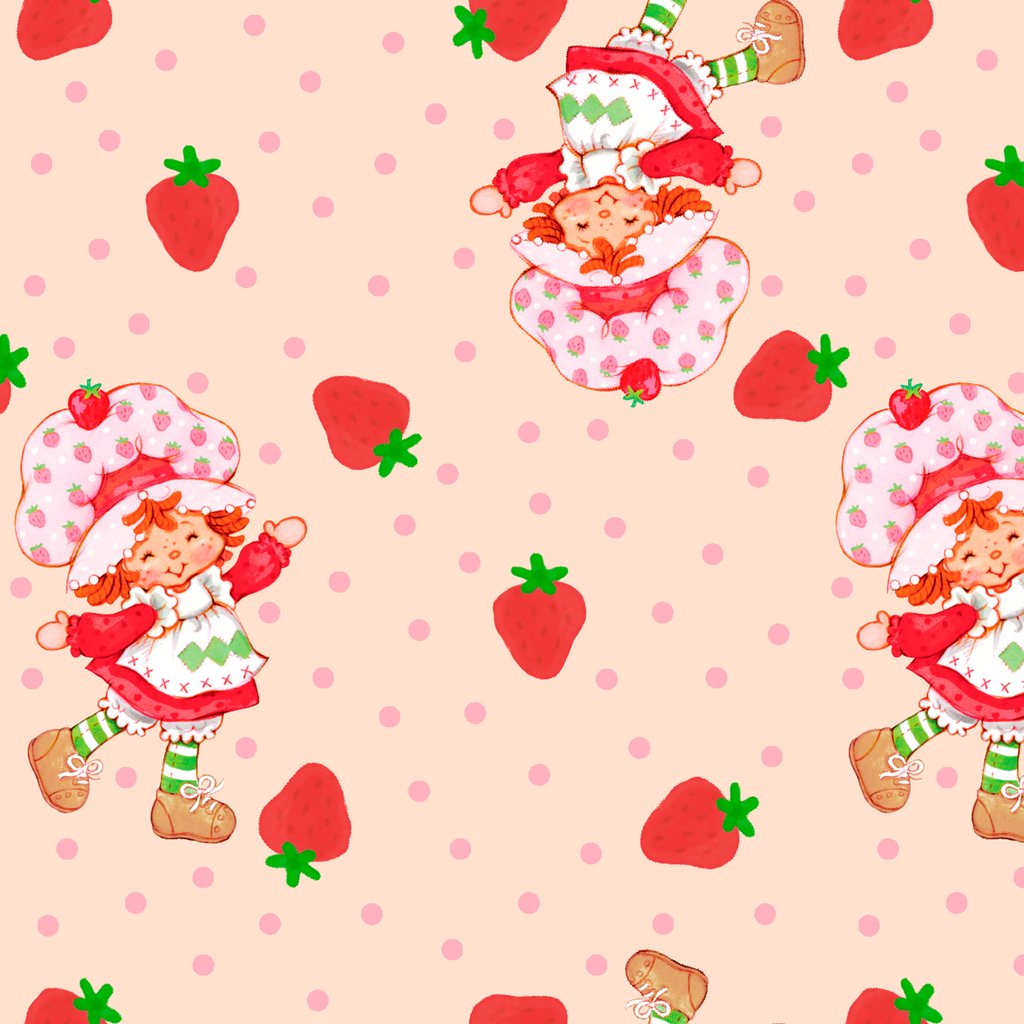Adorable Strawberry Shortcake pattern featuring the famous character dancing around with the iconic red hat surrounded by strawberries and polka dots on a cheerful cream background. Perfect for any space.