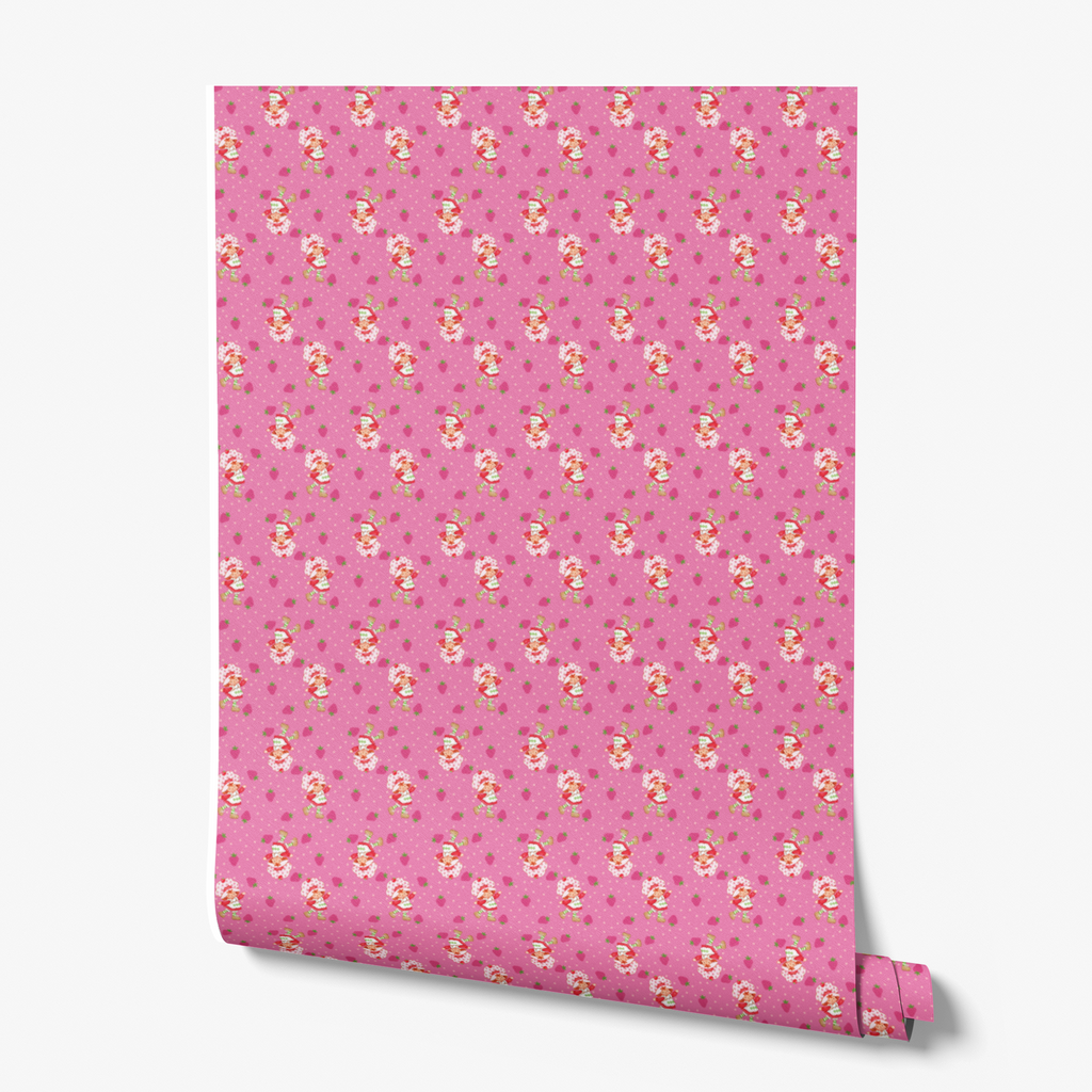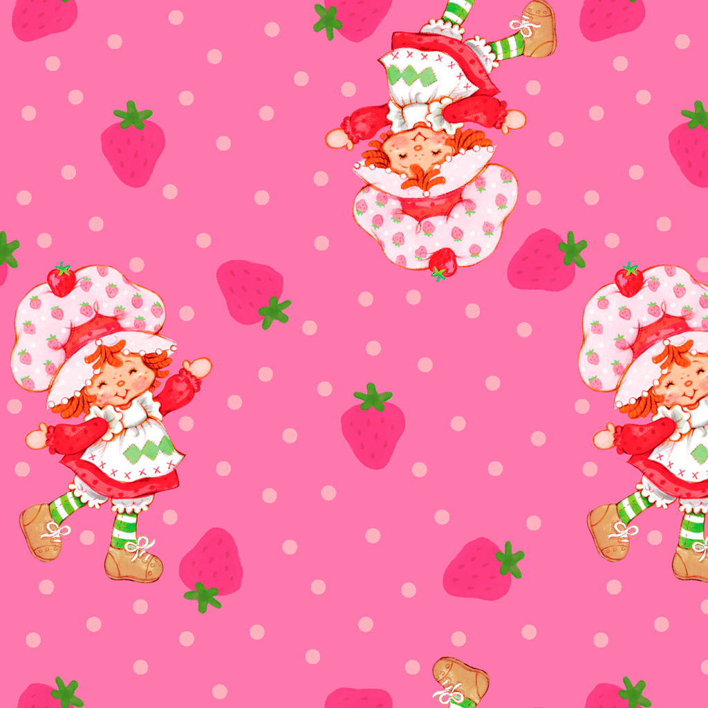 Adorable Strawberry Shortcake pattern featuring the famous character dancing around with the iconic red hat surrounded by strawberries and polka dots on a cheerful rose pink background. Perfect for any space.