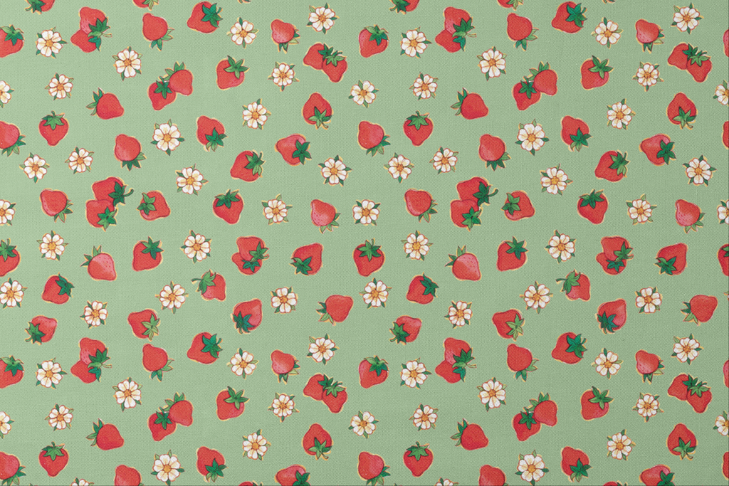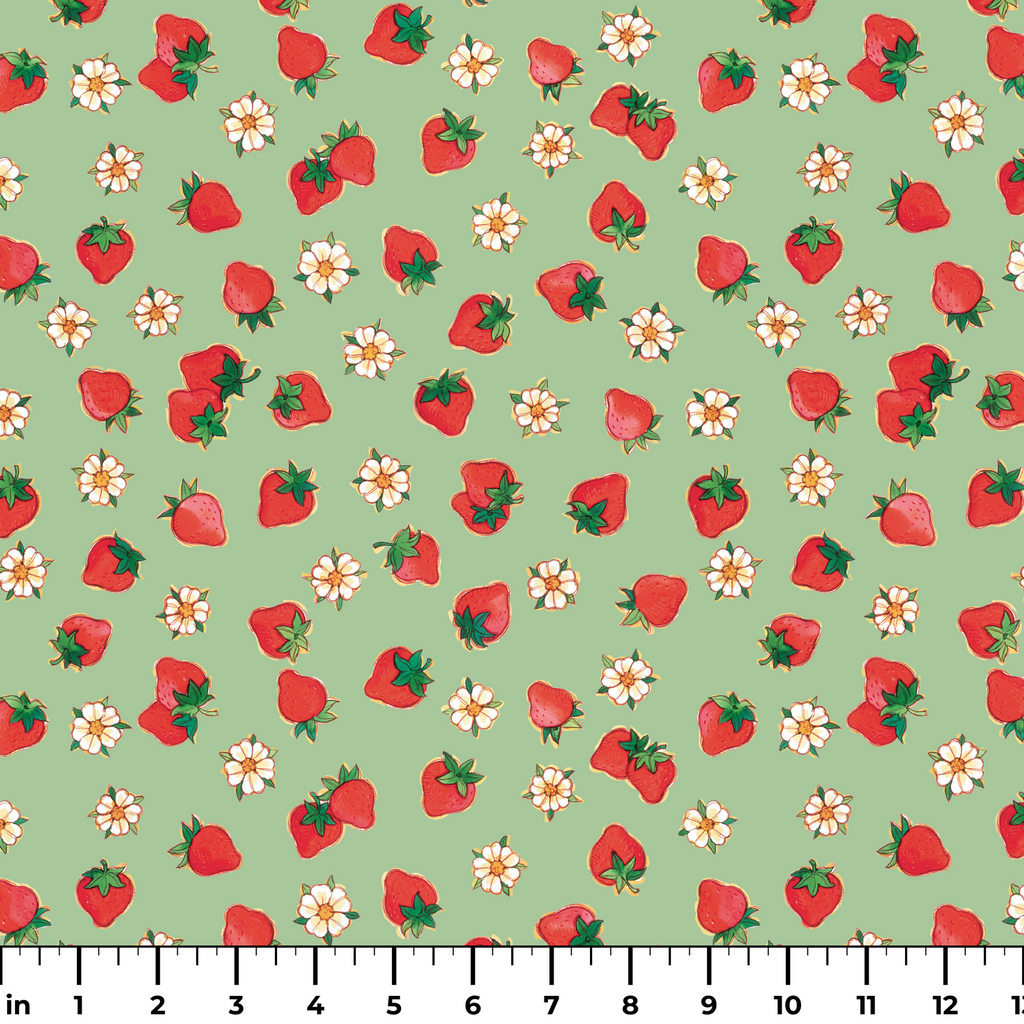Sweet Strawberry Shortcake berries with delicate white flowers on a green background. Perfect for summer kitchen decor or berry-themed crafts and accessories.