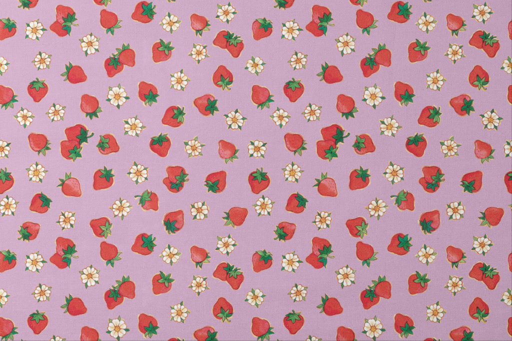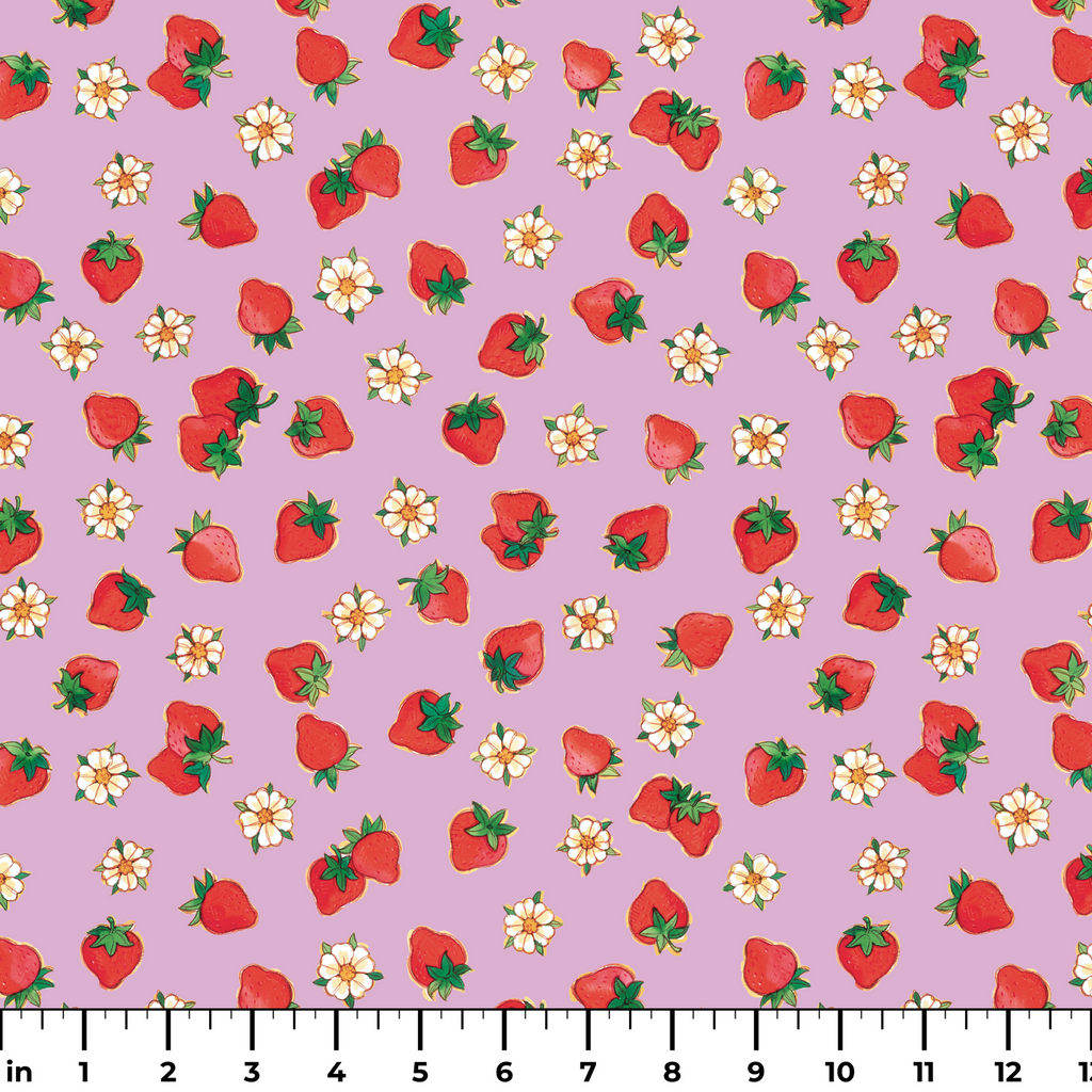 Sweet Strawberry Shortcake berries with delicate white flowers on a lilac background. Perfect for summer kitchen decor or berry-themed crafts and accessories.
