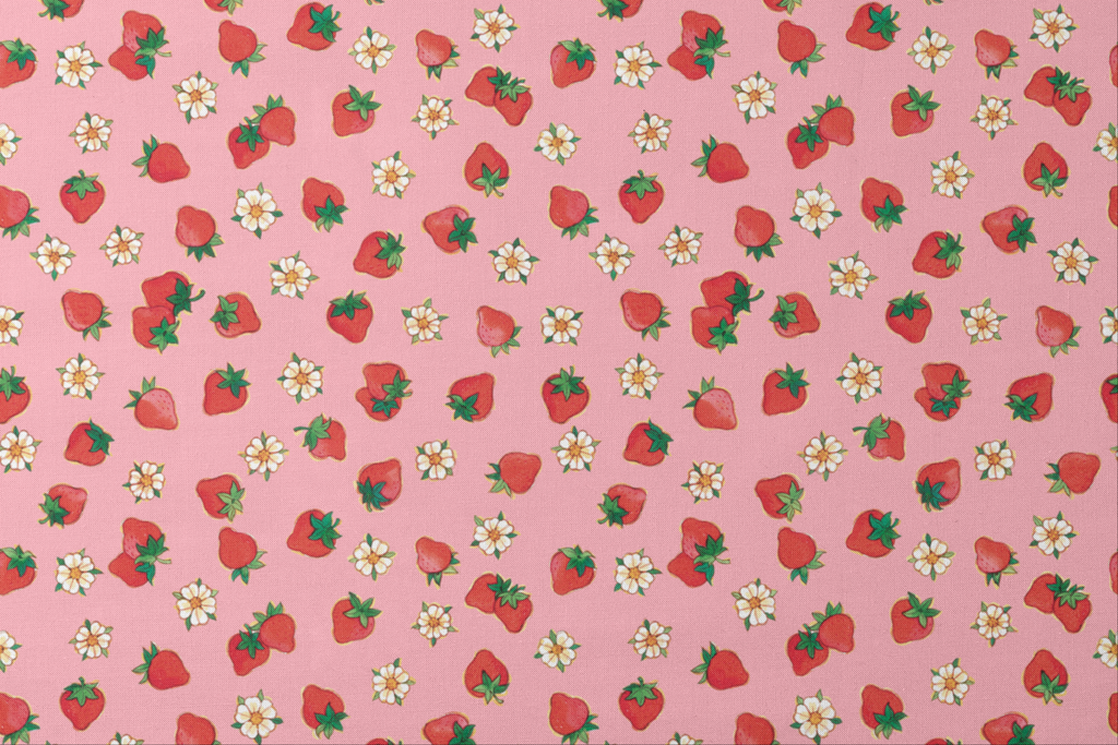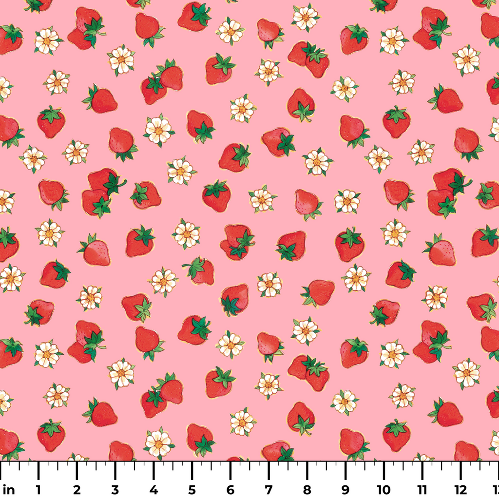Sweet Strawberry Shortcake berries with delicate white flowers on a pink background. Perfect for summer kitchen decor or berry-themed crafts and accessories.