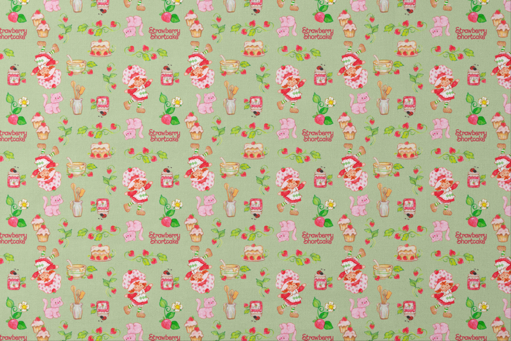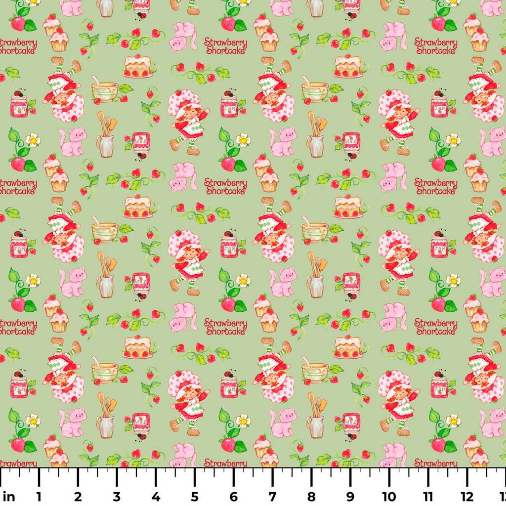 Sweet retro Strawberry Shortcake pattern featuring desserts, tea cups, kitchen utensils and Custard the Cat on a green background. Perfect for kitchen decor or nostalgic children's items.