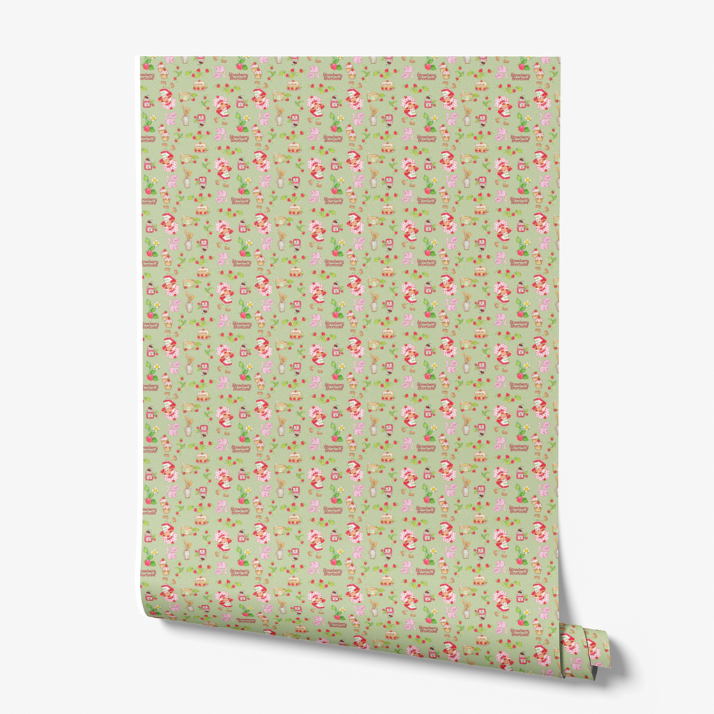 Sweet retro Strawberry Shortcake pattern featuring desserts, tea cups, kitchen utensils and Custard the Cat on a green background. Perfect for kitchens and children's rooms.