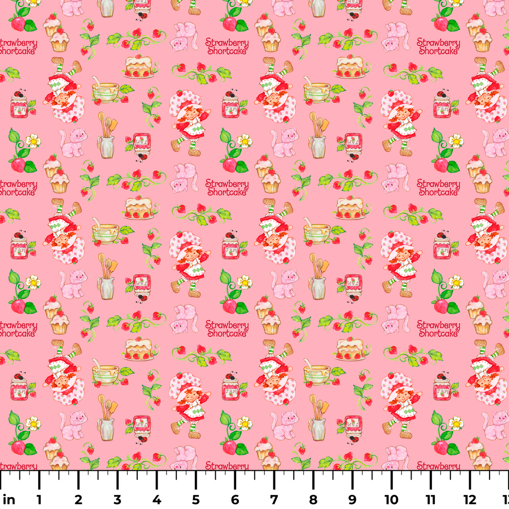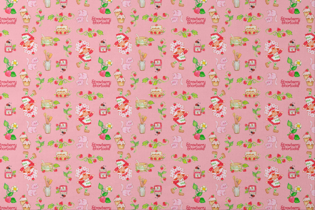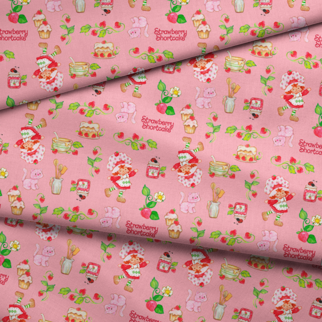 Sweet retro Strawberry Shortcake pattern featuring desserts, tea cups, kitchen utensils and Custard the Cat on a pink background. Perfect for kitchen decor or nostalgic children's items.