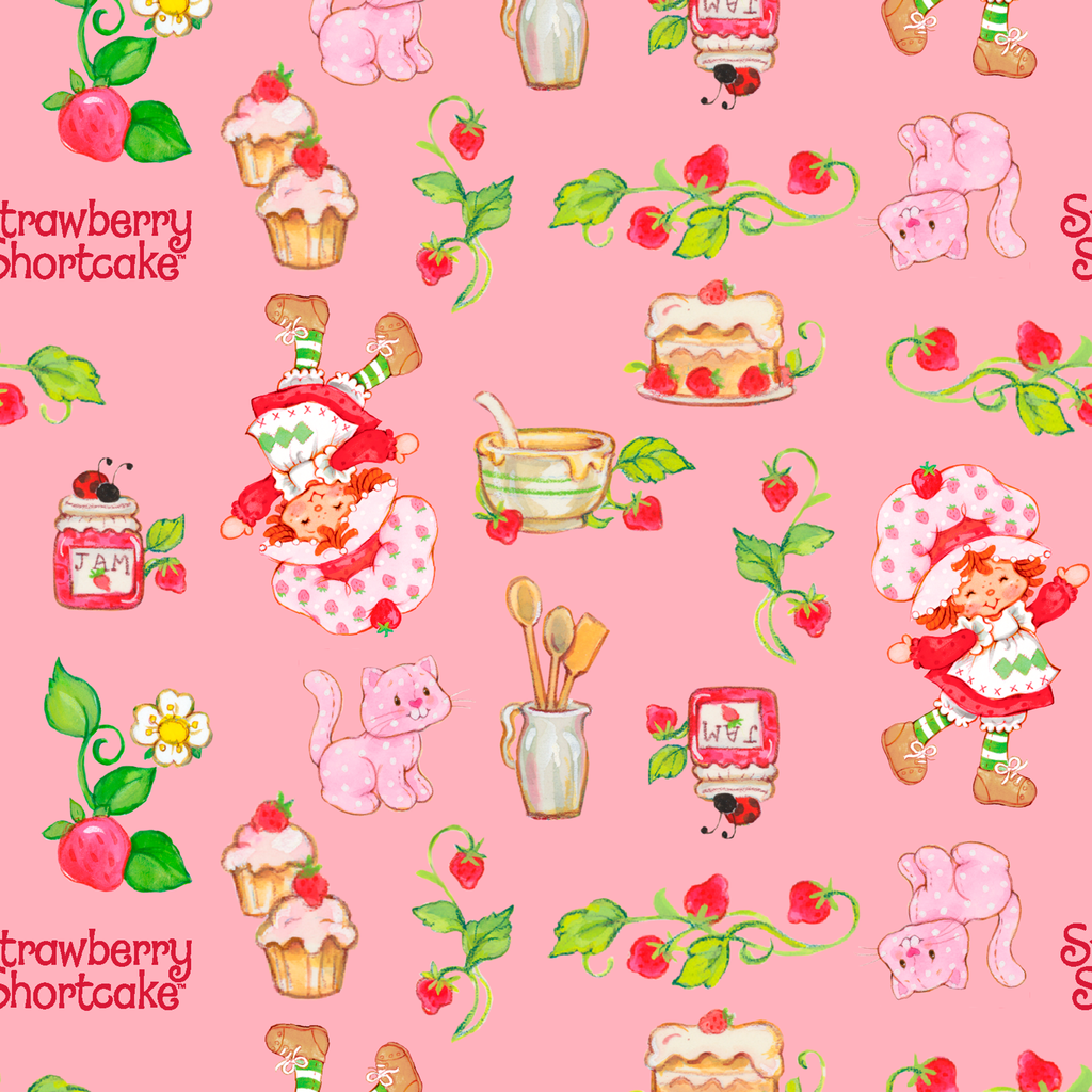 Sweet retro Strawberry Shortcake pattern featuring desserts, tea cups, kitchen utensils and Custard the Cat on a pink background. Perfect for kitchens and children's rooms.