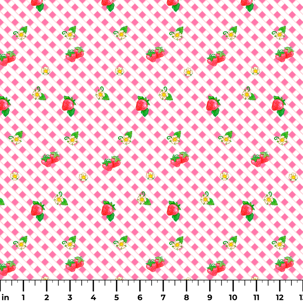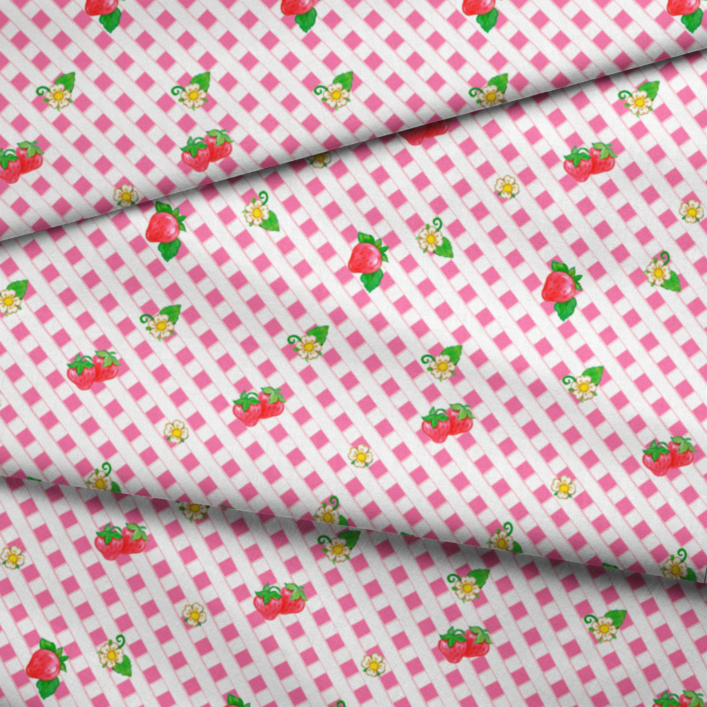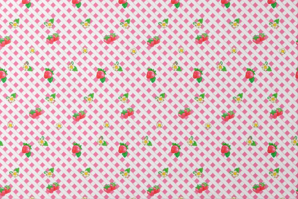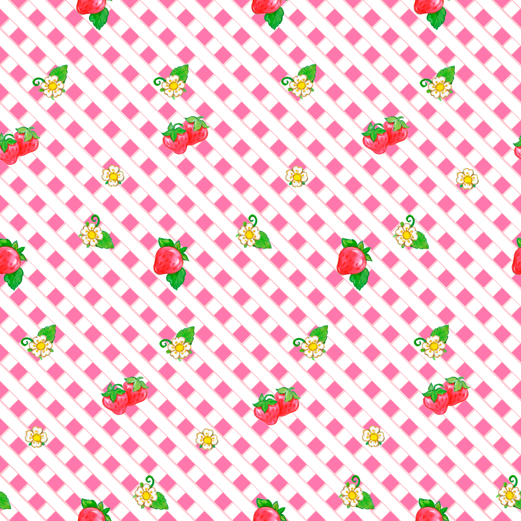 Sweet Strawberry Shortcake berries scattered on a pink lattice background to create a cheerful vintage theme. Perfect for summer home decor.