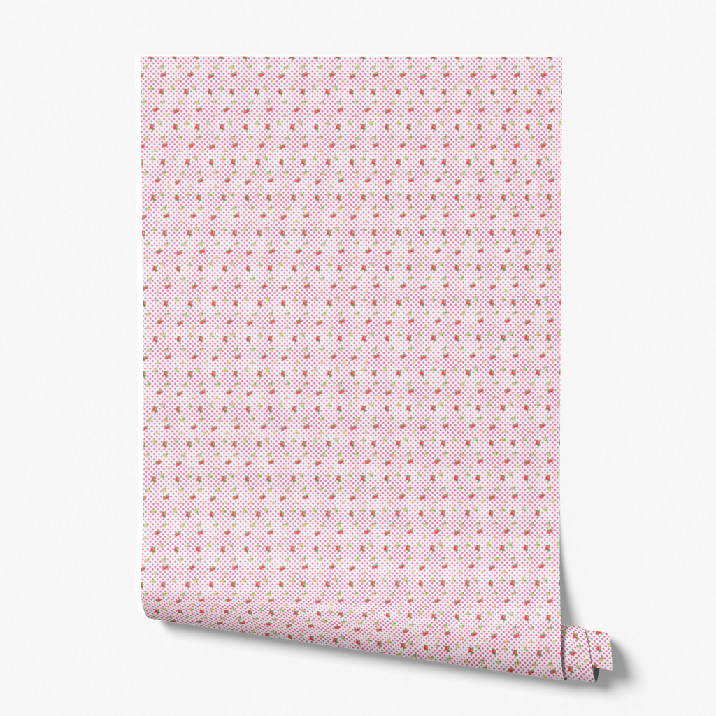 Sweet Strawberry Shortcake berries scattered on a pink lattice background to create a cheerful vintage theme. Perfect for summer-inspired spaces.