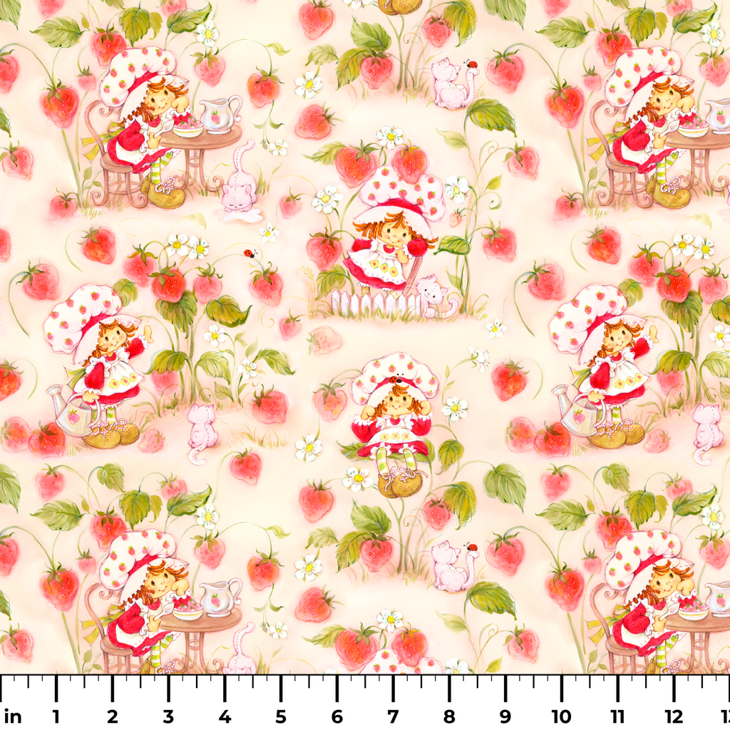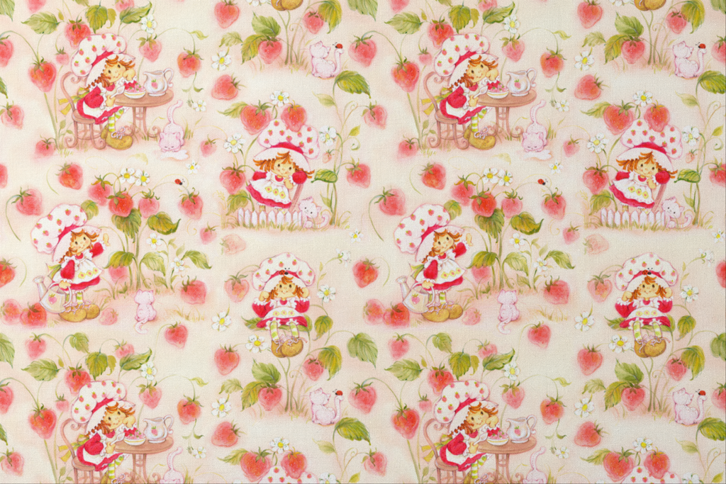 Charming Strawberry Shortcake pattern featuring the iconic character in a red bonnet at tea party in a sweet forest scene. Perfect for nursery decor or children's fashion.