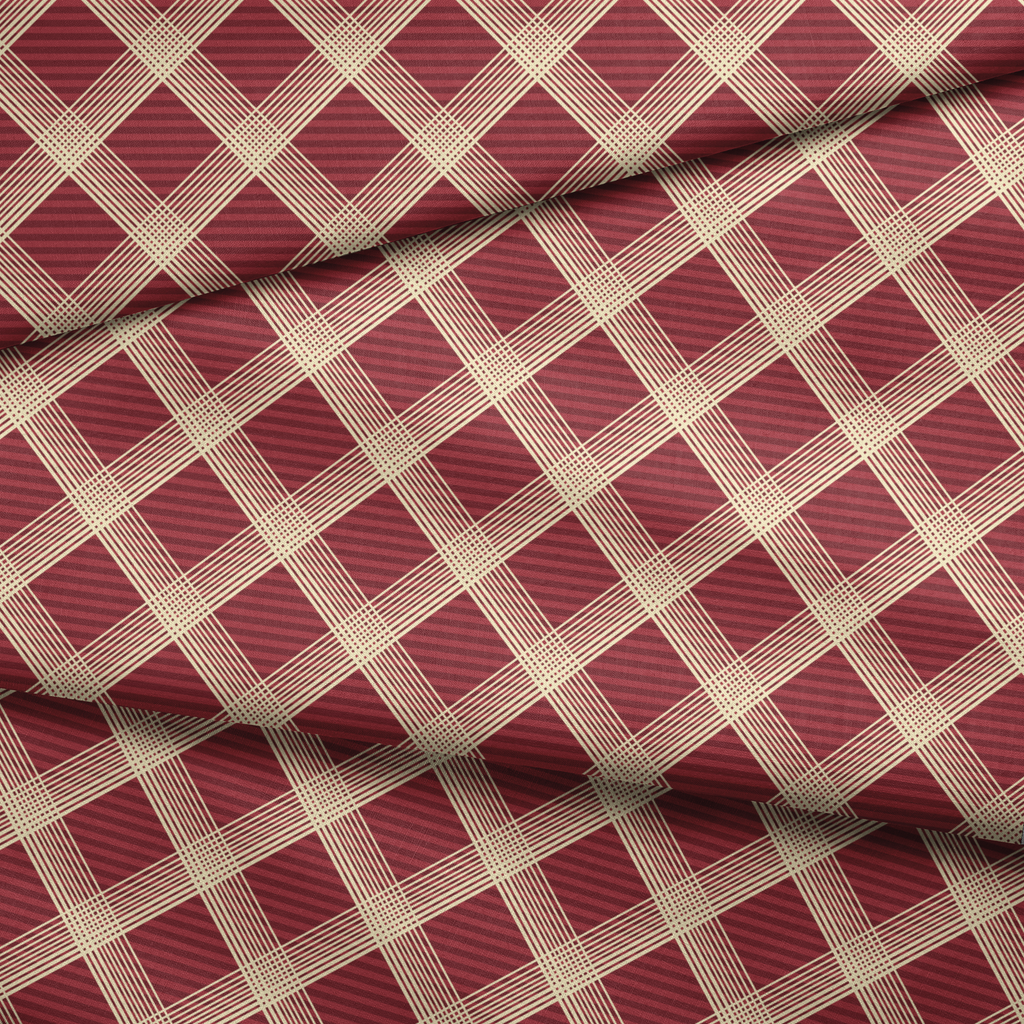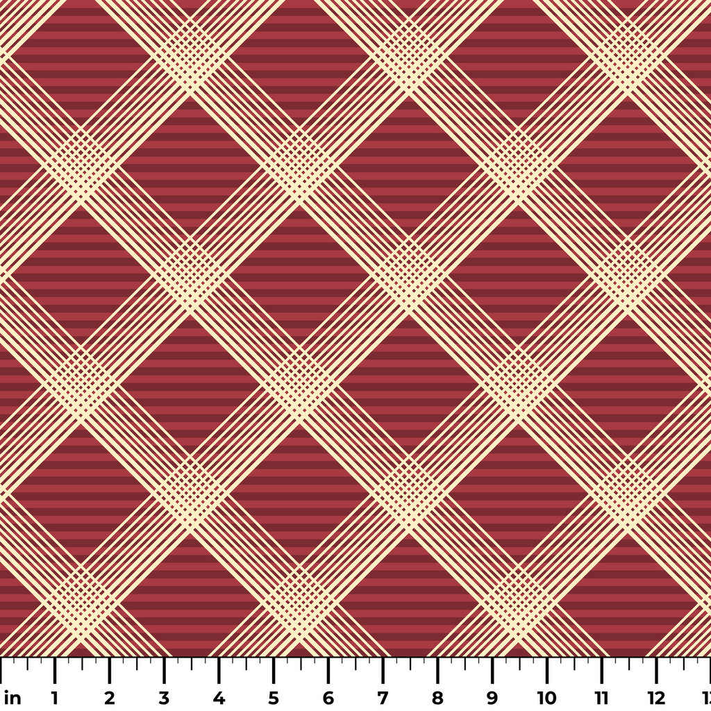 Elegant geometric pattern featuring burgundy stripes and cream diagonal crosshatching for a sophisticated mid-century modern aesthetic.