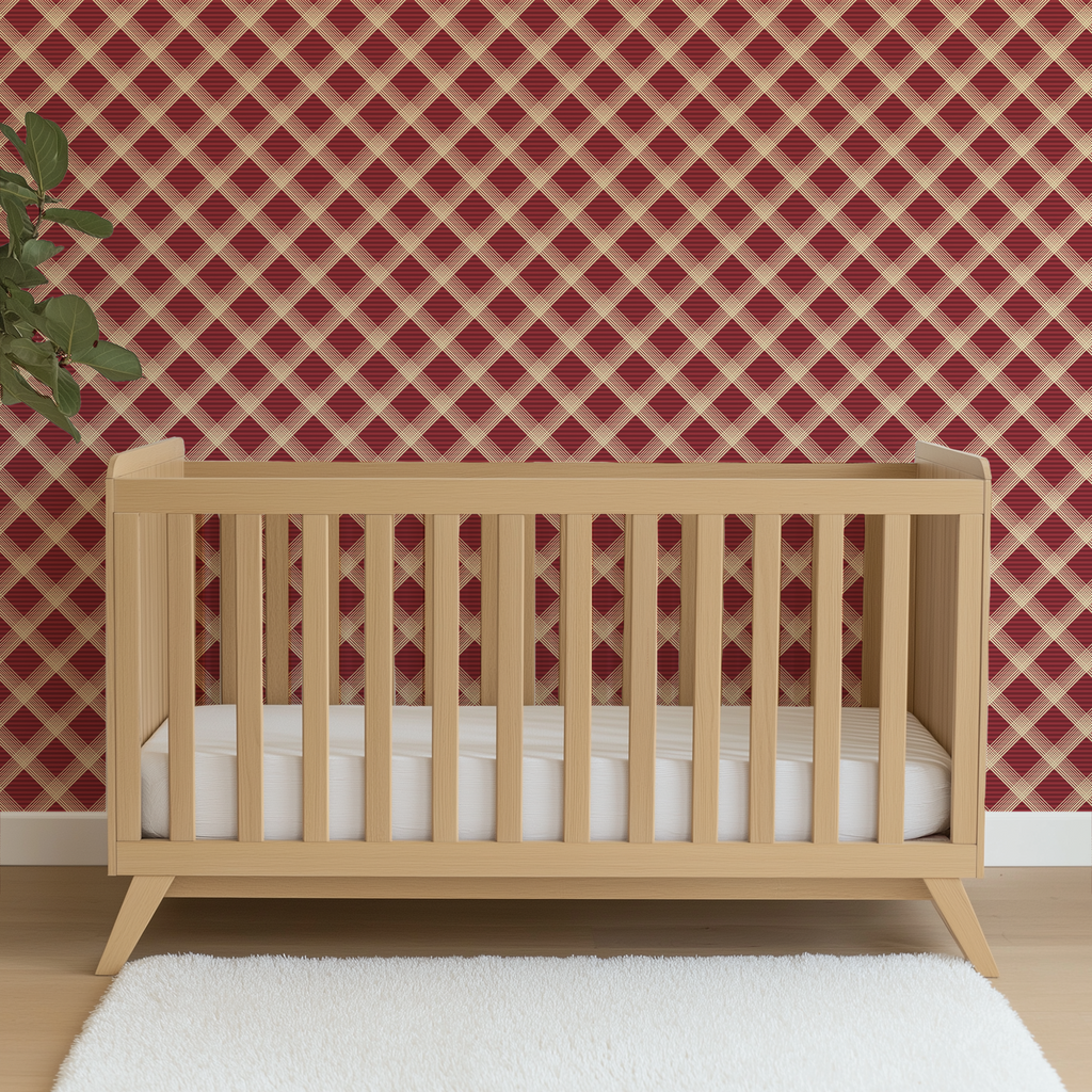 Elegant geometric pattern featuring burgundy stripes and cream diagonal crosshatching for a sophisticated mid-century modern aesthetic.