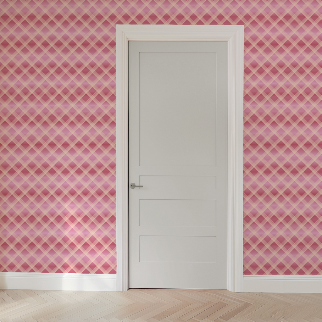 Elegant geometric pattern featuring pink stripes and cream diagonal crosshatching for a sophisticated mid-century modern aesthetic.