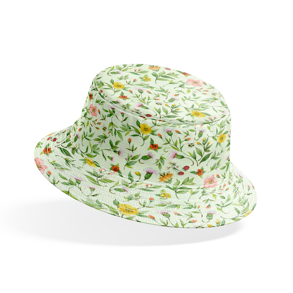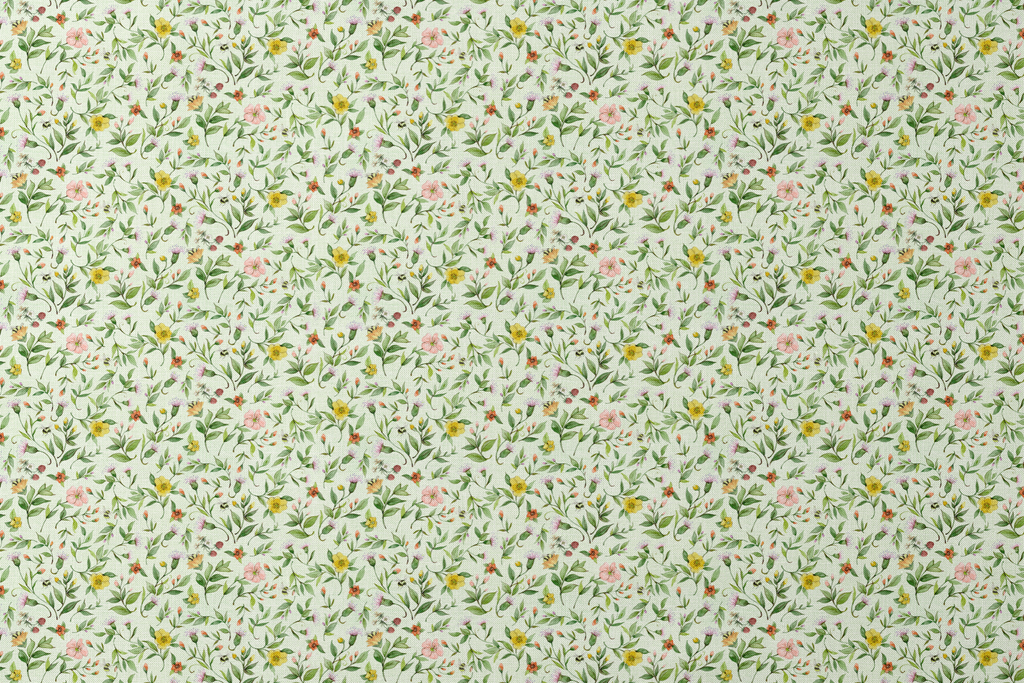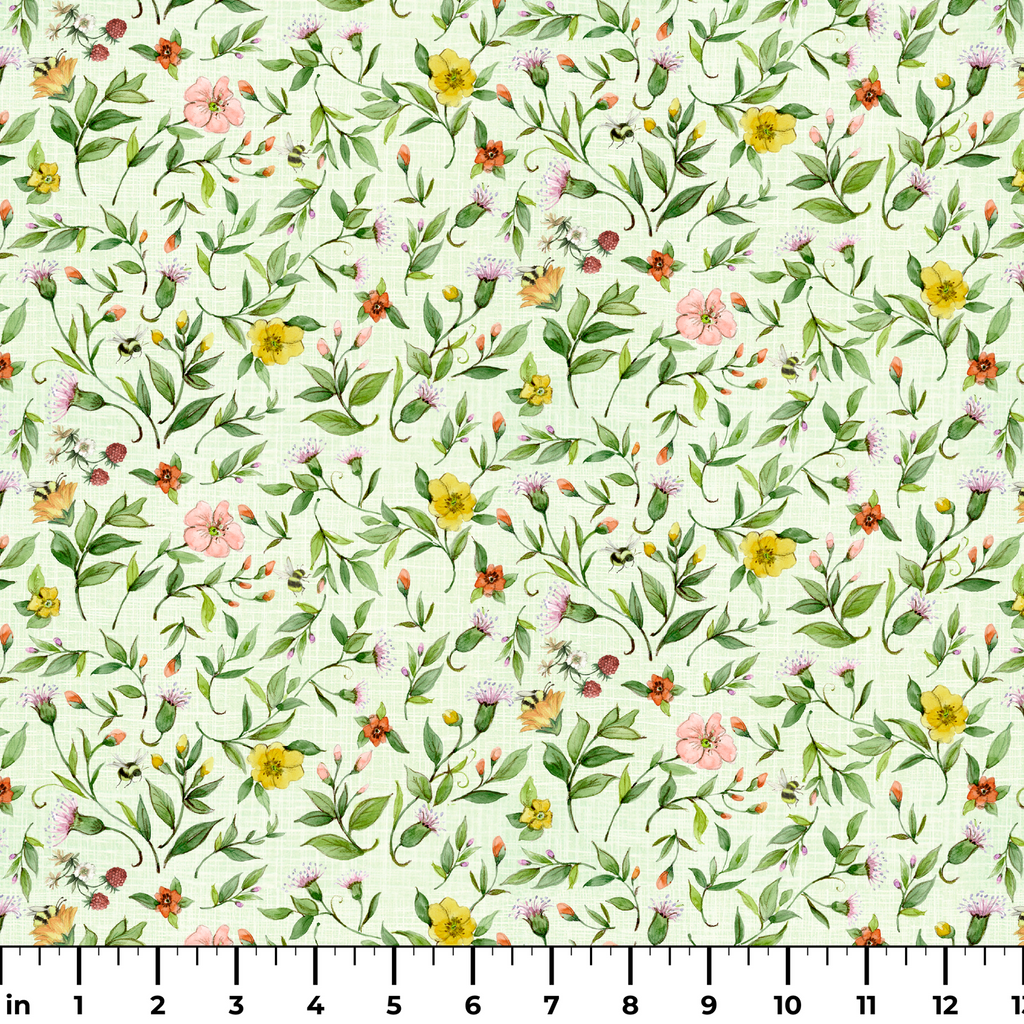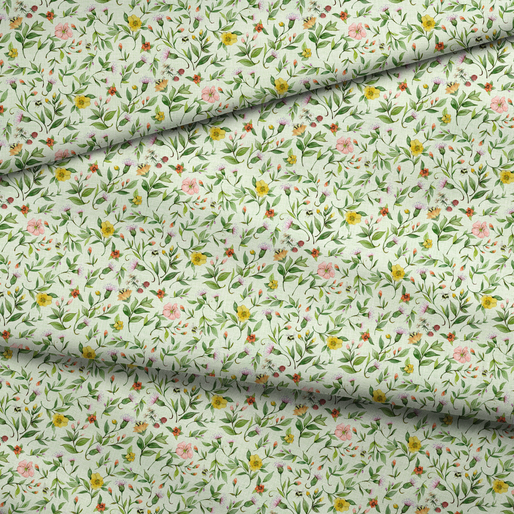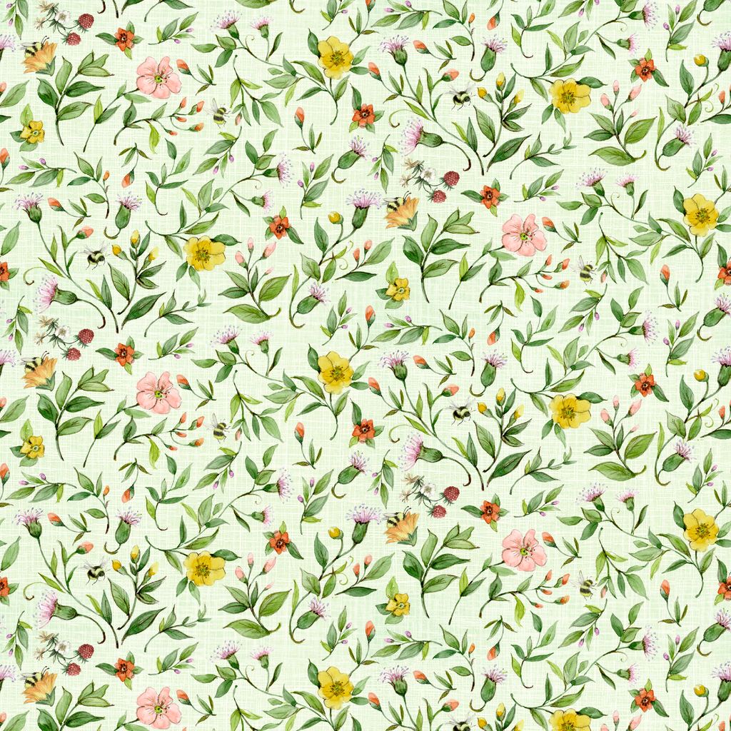 Delicate botanical design featuring scattered wildflowers and bees in yellow, orange and pink hues with green foliage on a soft green background, perfect for spring and summer decor.