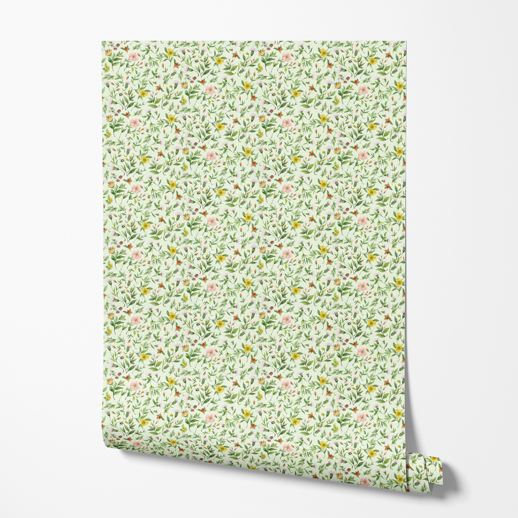 Delicate botanical design featuring scattered wildflowers and bees in yellow, orange and pink hues with green foliage on a soft green background, perfect for a spring and summer aesthetic.
