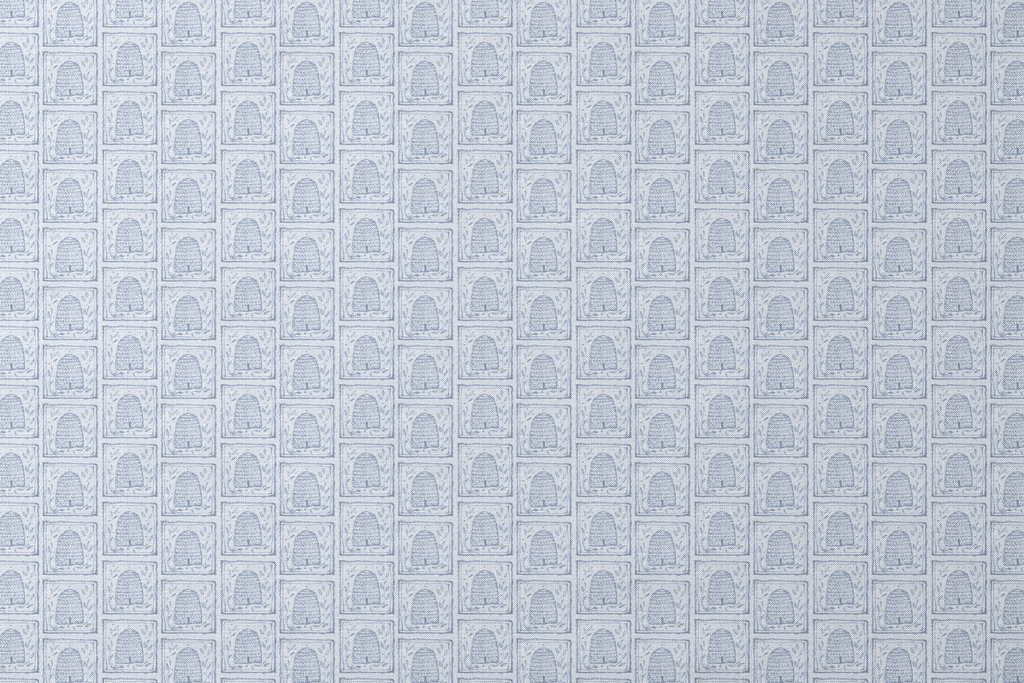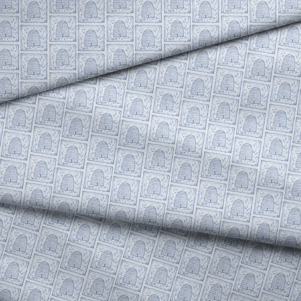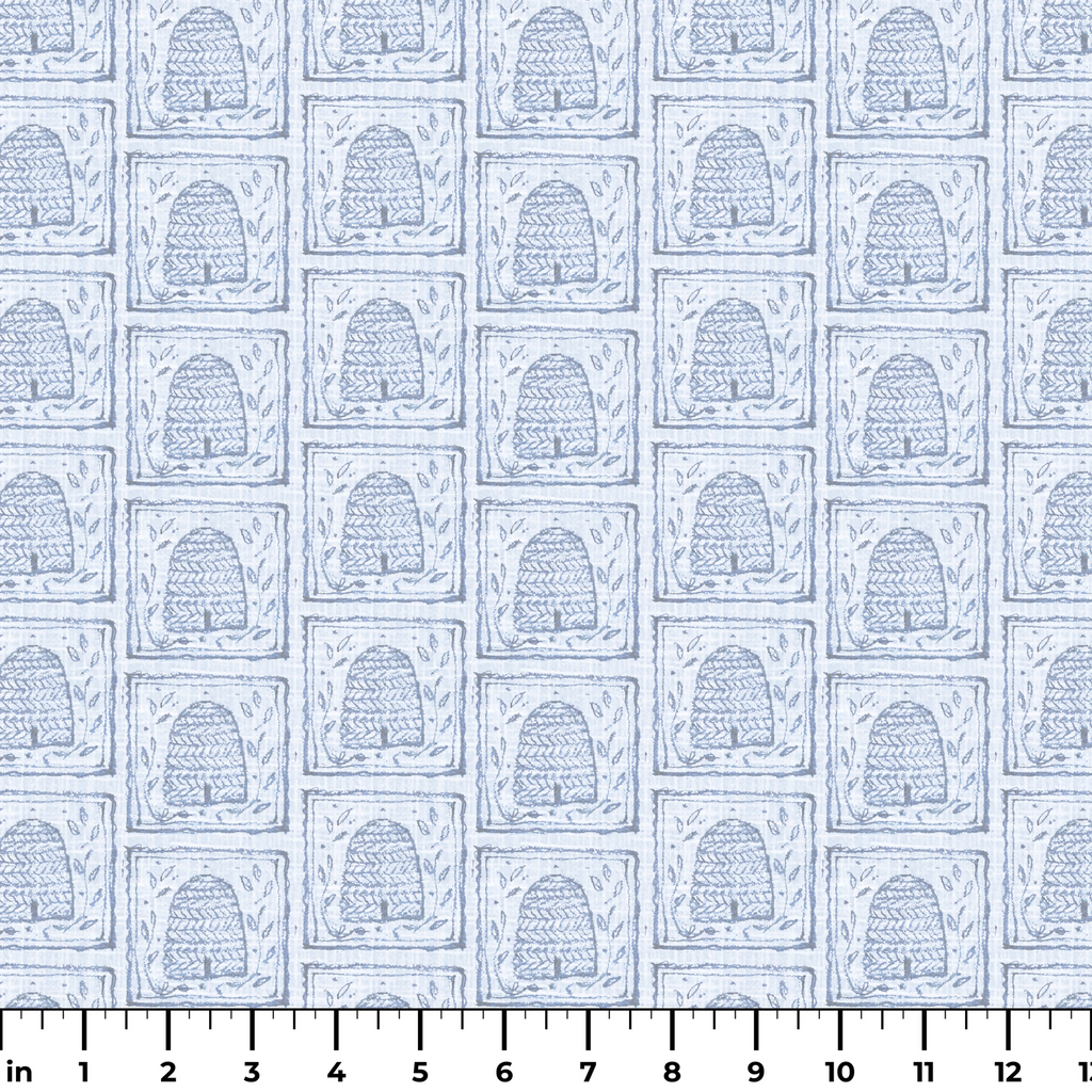 Delicate blue and white beehive stamp pattern with botanical elements that create a vintage farmhouse aesthetic. Perfect for rustic home decor.