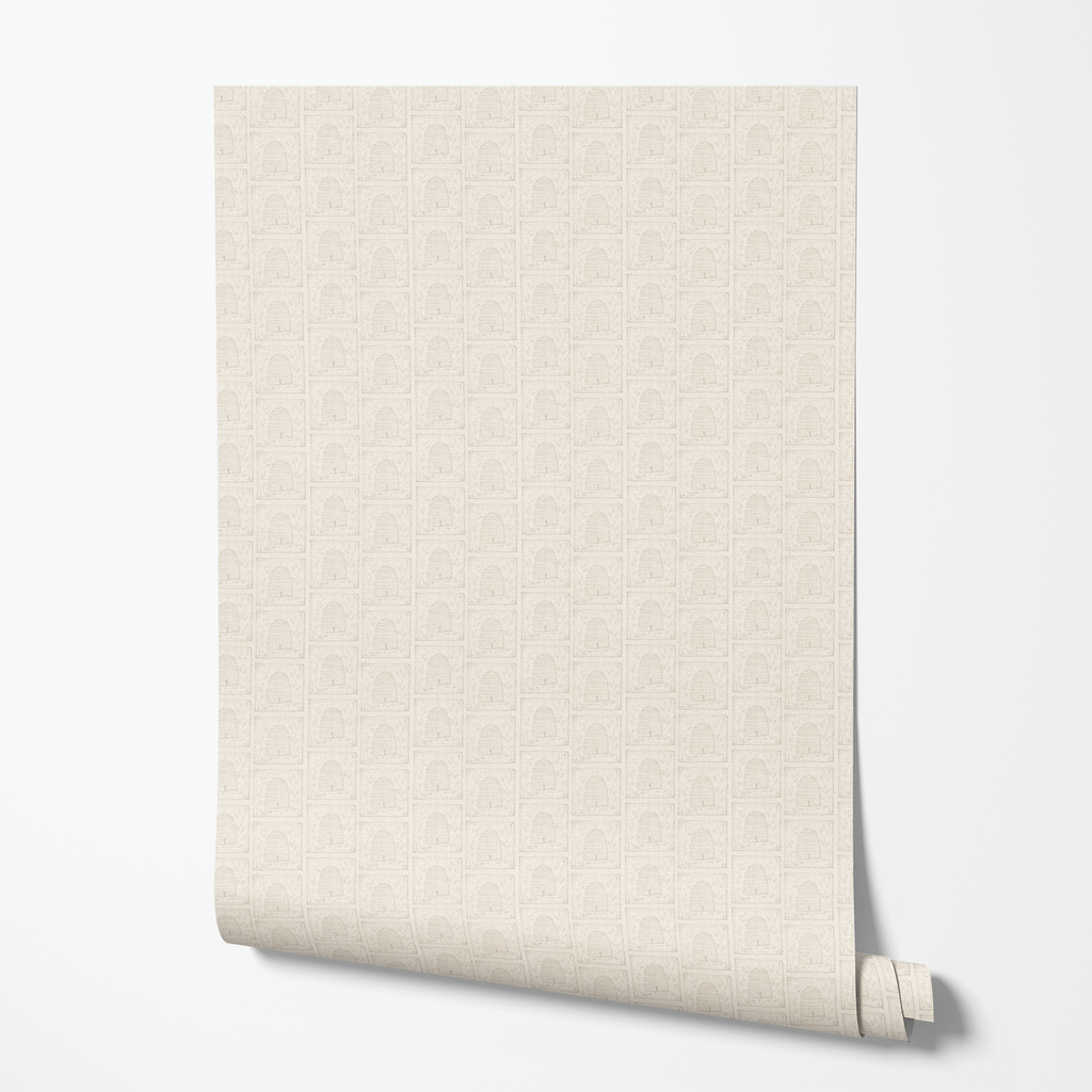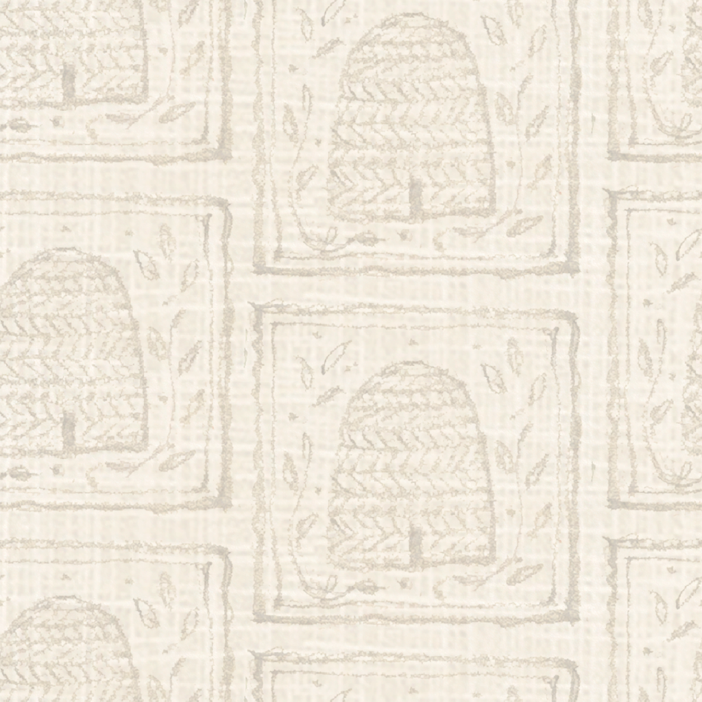 Subtle tan background featuring delicate beehive motifs & stamps with botanical elements in a vintage folk-art style. Perfect for any space with its soft neutral palette and natural imagery.