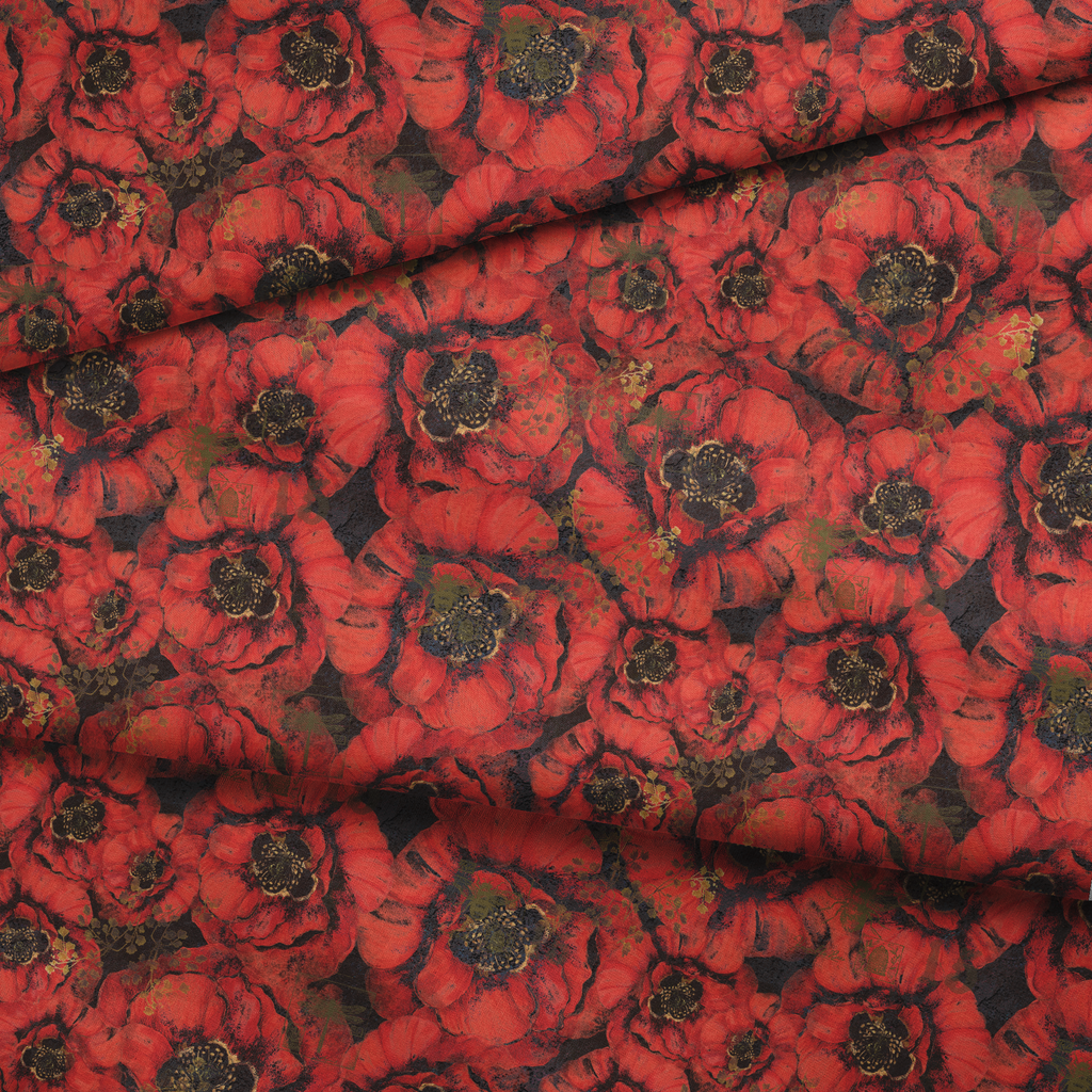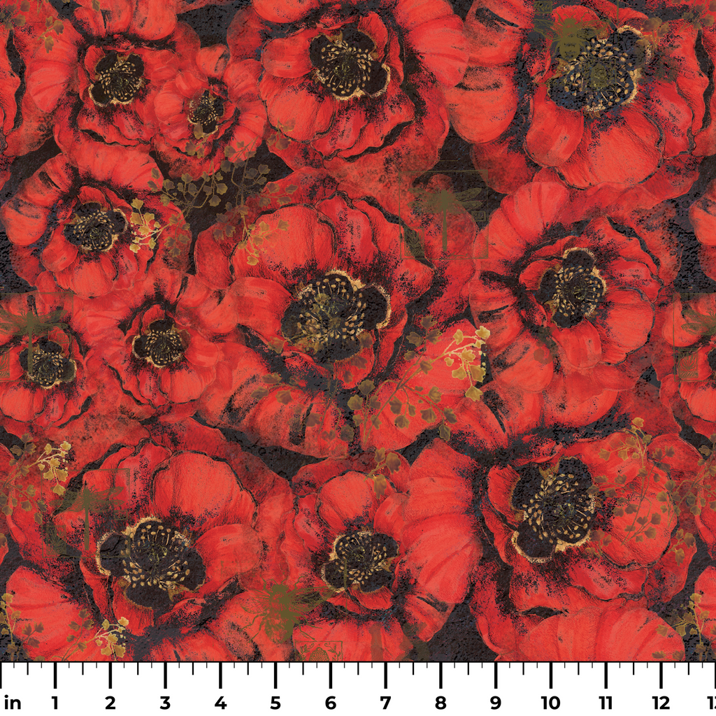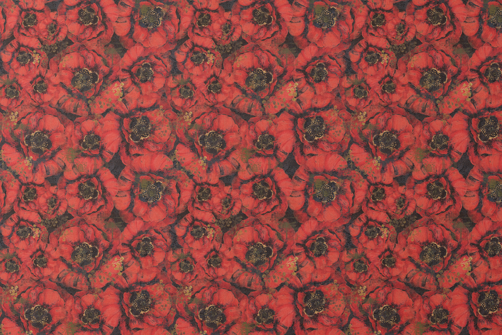 Vibrant red poppies bloom in rich detail against a dark background, creating a stunning floral pattern with dramatic contrast and luxurious texture. Perfect for home decor.
