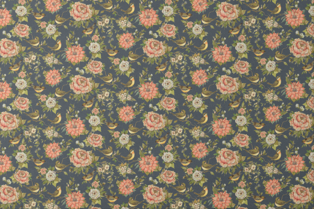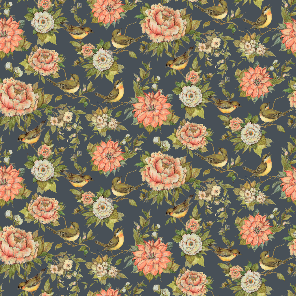 A refined botanical paradise unfolds against a deep charcoal background, where delicate songbirds with olive-green wings and buttery yellow breasts rest among luscious blooms. Coral-hued peonies and dahlias mingle with creamy white garden roses, all rendered in a beautiful watercolor style that captures their vintage botanical charm. This sophisticated floral would bring timeless elegance to window treatments or statement pillows for your reading nook.