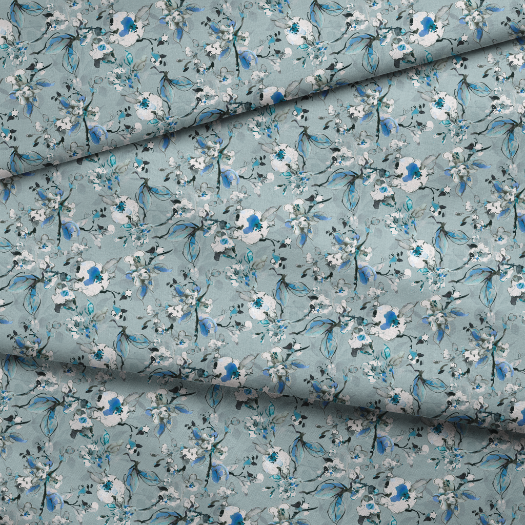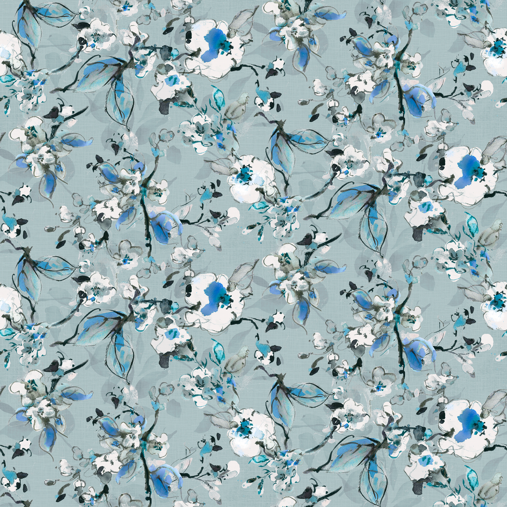 Elegant floral pattern with delicate white blossoms and blue accents arranged on a soft gray-blue background, creating a serene and sophisticated design perfect for home decor.