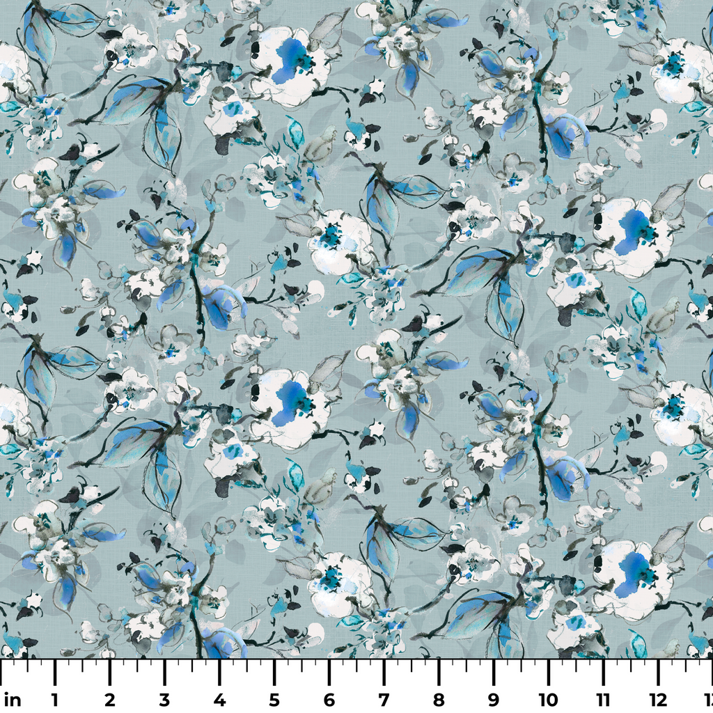 Susan Winget Branch Floral Watercolor on Blue Fabric