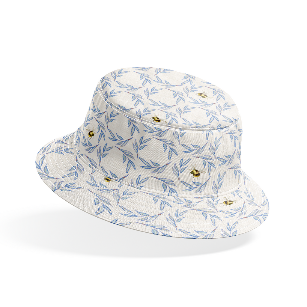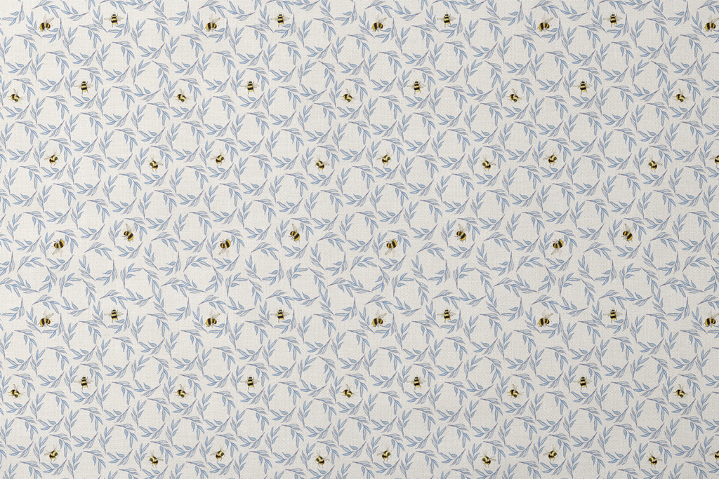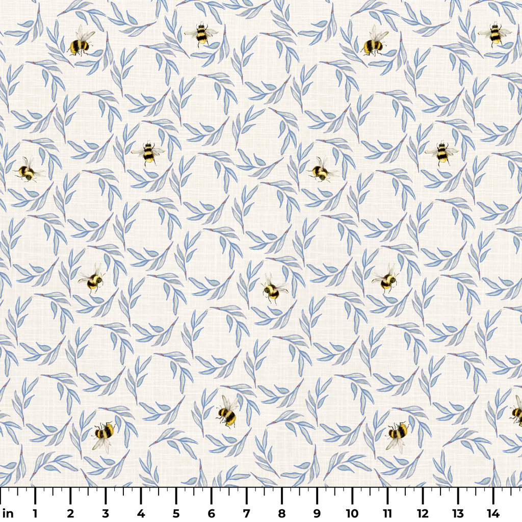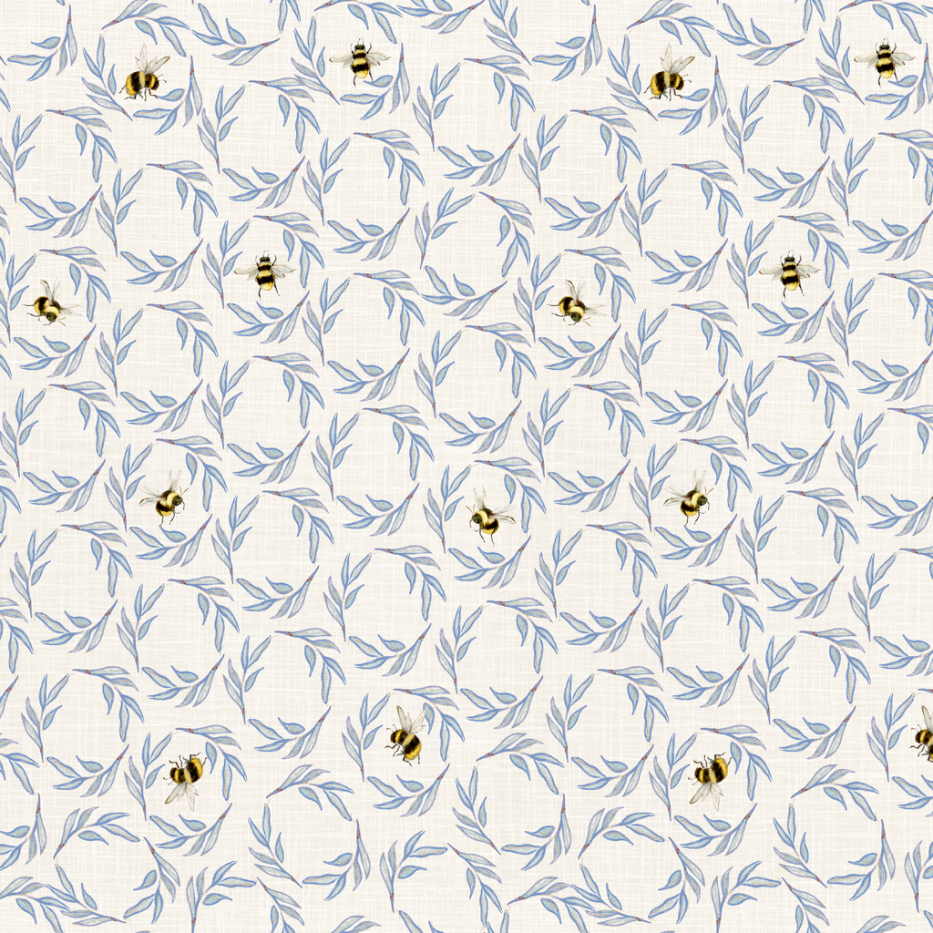 Delicate blue leaf circles featuring buzzing bumblebees scattered throughout on a cream background, creating a charming nature-inspired design perfect for any home decor or crafting project.