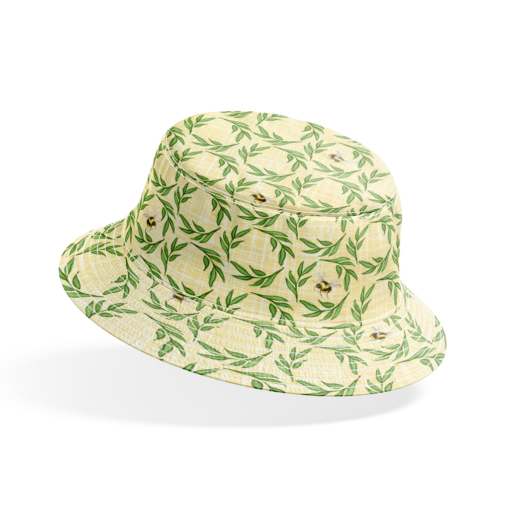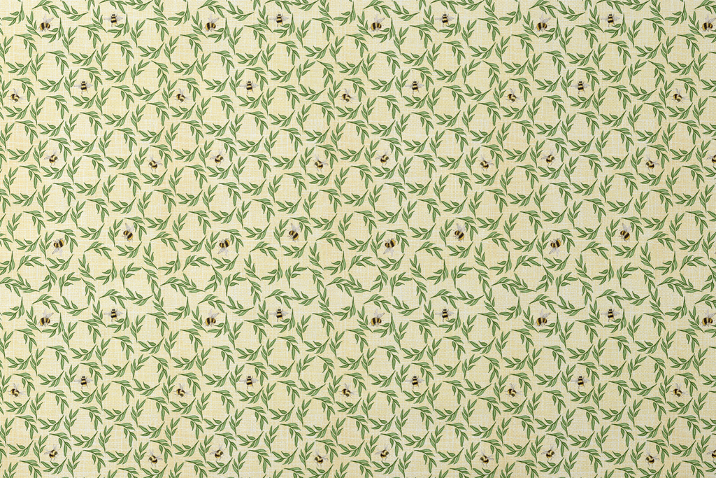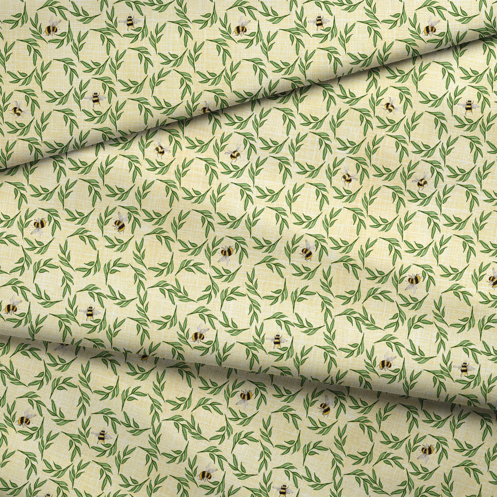 Delicate green leaves and small floral elements with bees create an elegant botanical design on a soft yellow background, perfect for nature-inspired home decor.