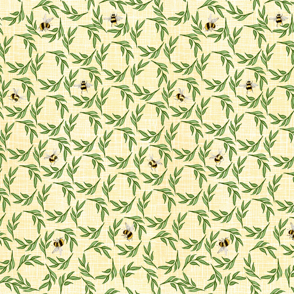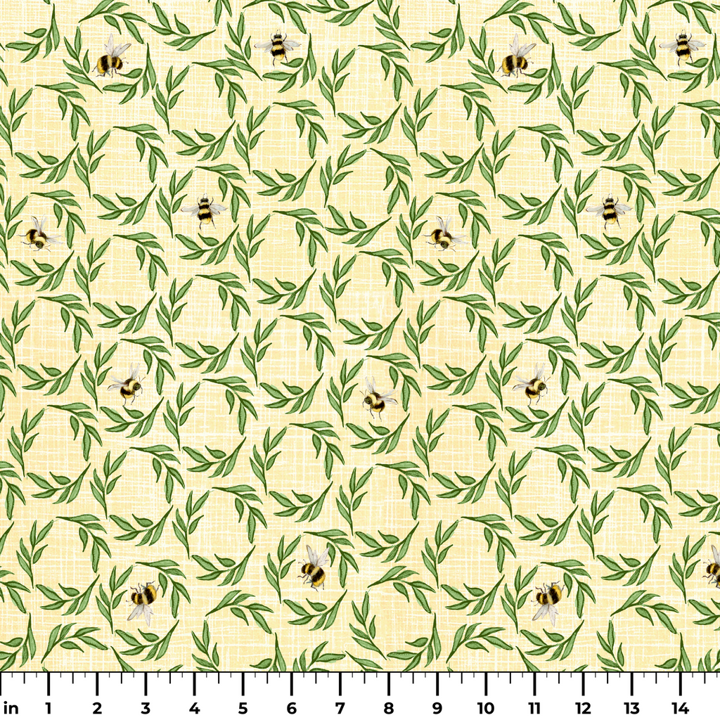 Susan Winget Bumblebee Circle Leaves on Yellow Fabric