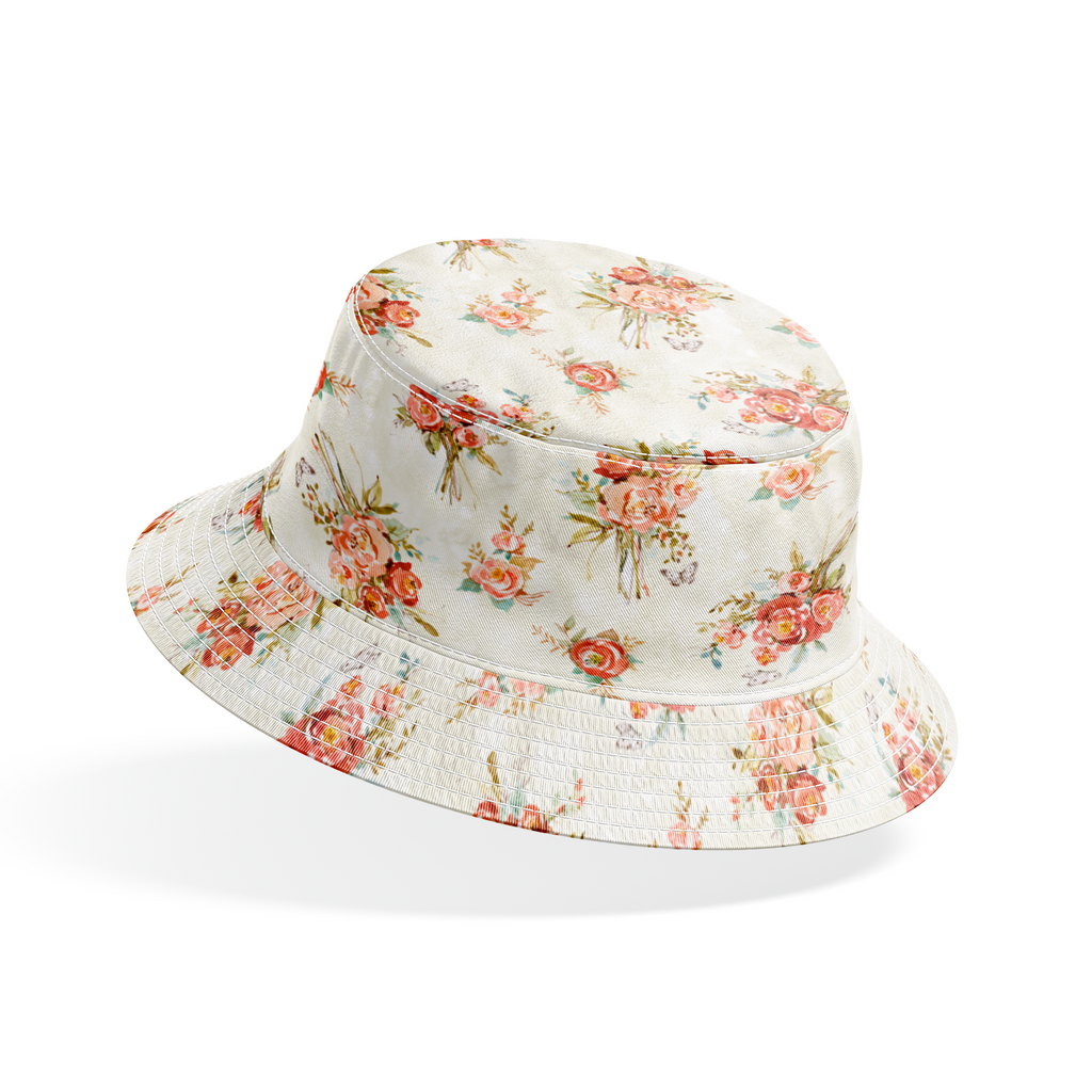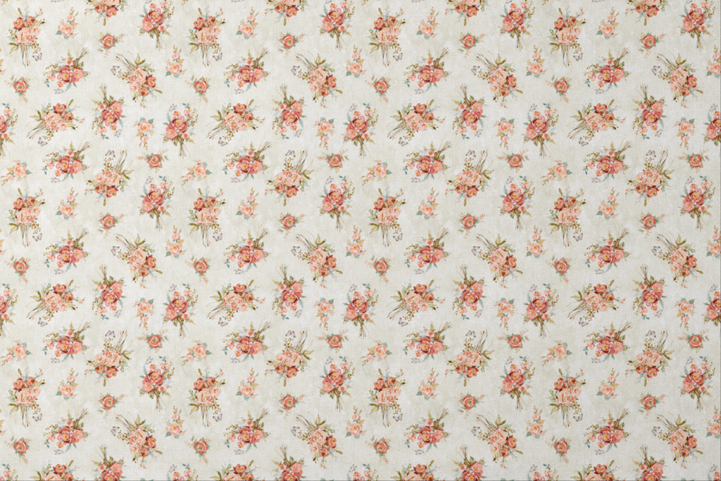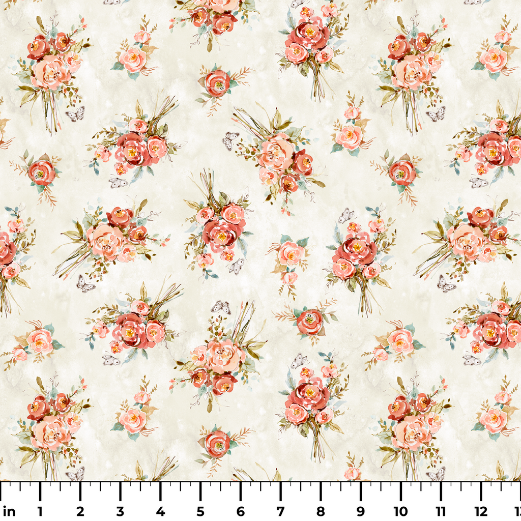 Delicate watercolor bouquets of coral and blush roses scattered across a creamy ivory background create an elegant botanical dreamscape. Each floral cluster is artfully tied with wispy stems and complemented by sage green foliage, while tiny butterflies flit between the blooms adding whimsical movement to the design. This romantic fabric would bring timeless charm to quilted bedspreads or lined curtains that catch the morning light just right.
