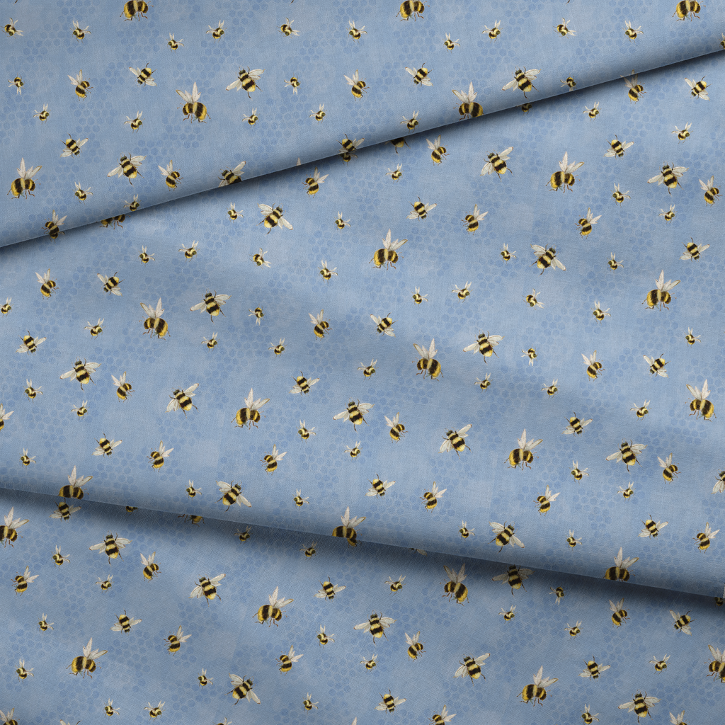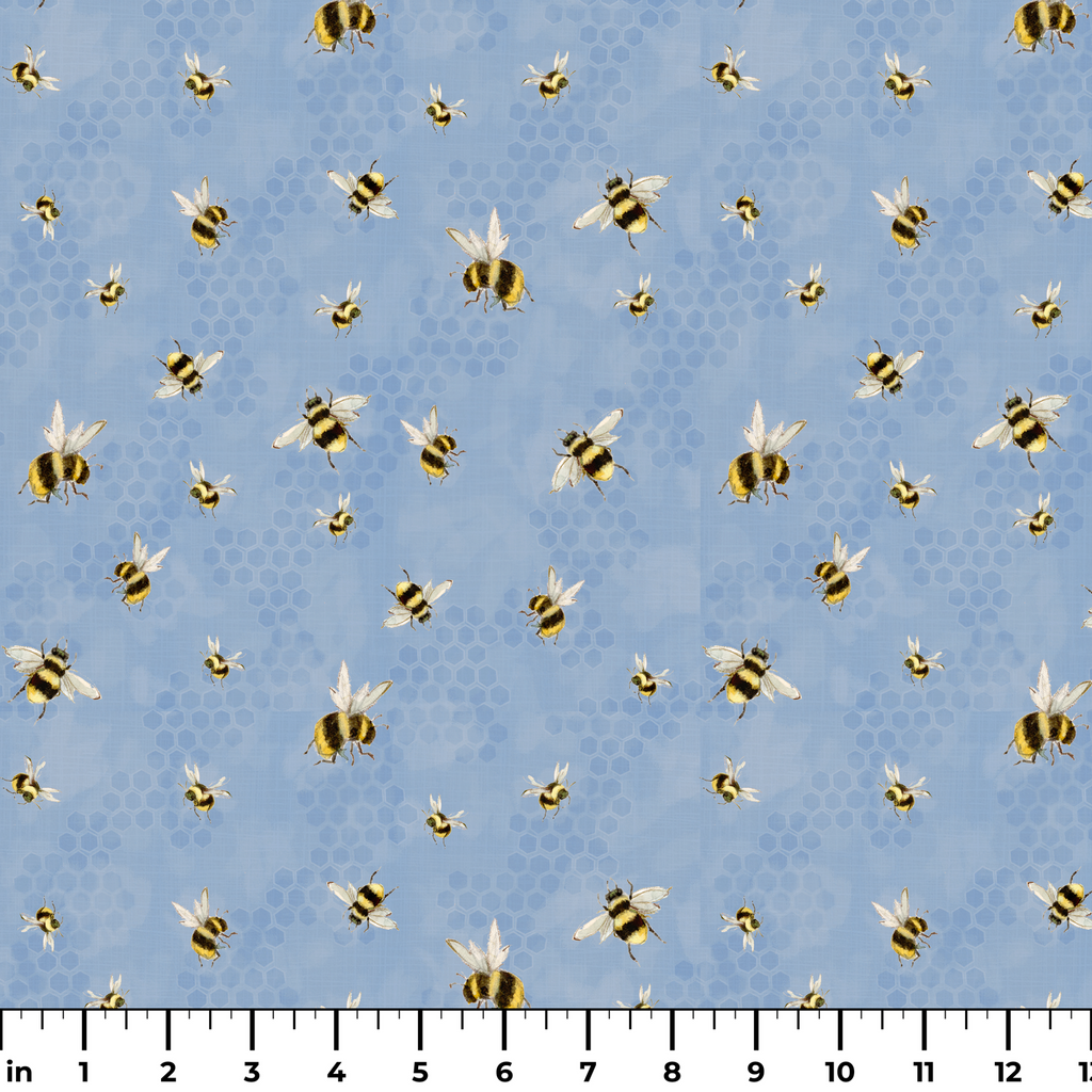Susan Winget Buzzing Honeybees on Blue Fabric