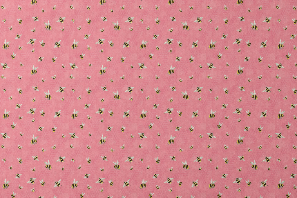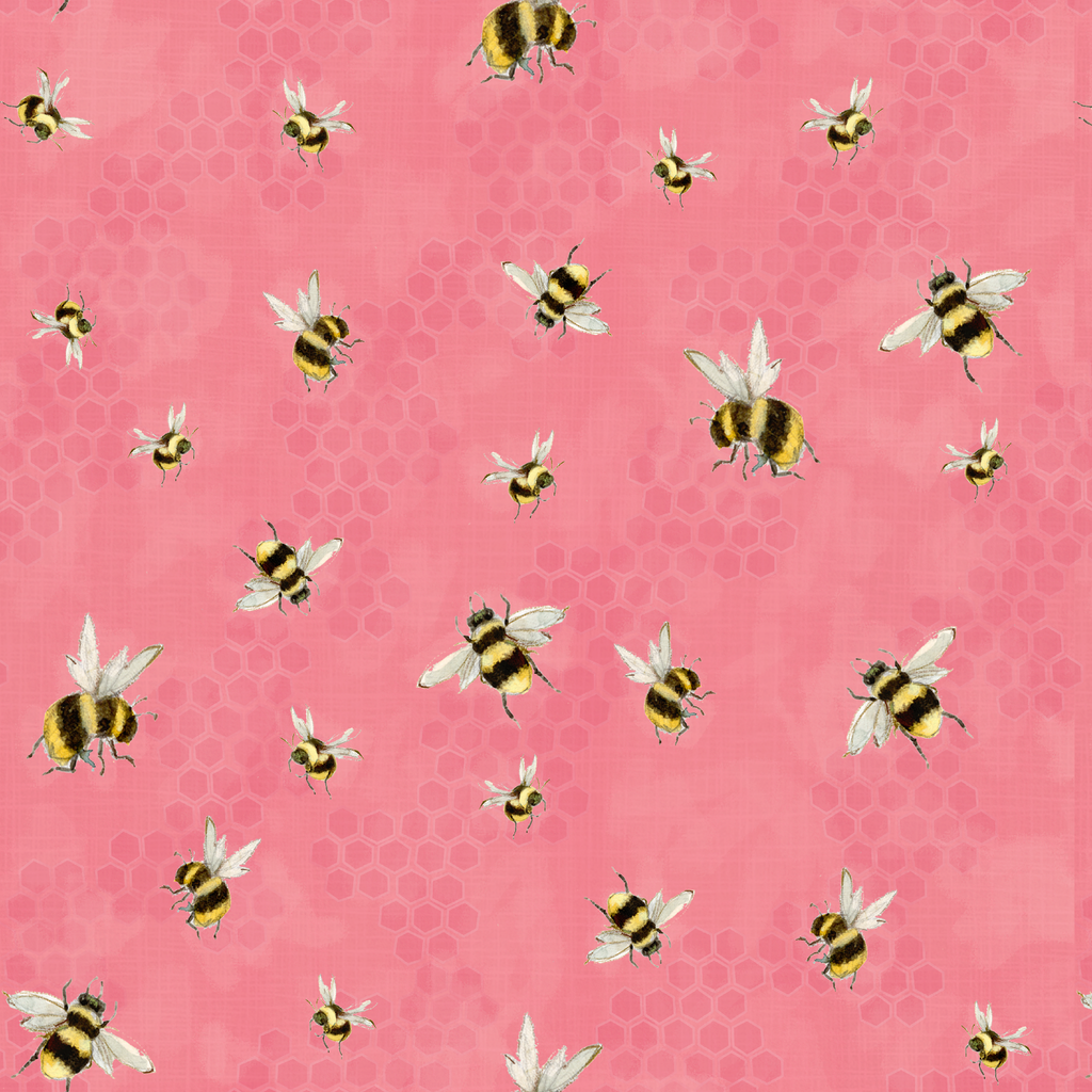Sweet bumblebees buzz across a pink honeycomb background in this whimsical nature-inspired pattern, perfect for quilting or children's room decor.