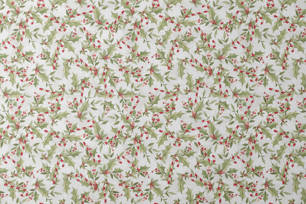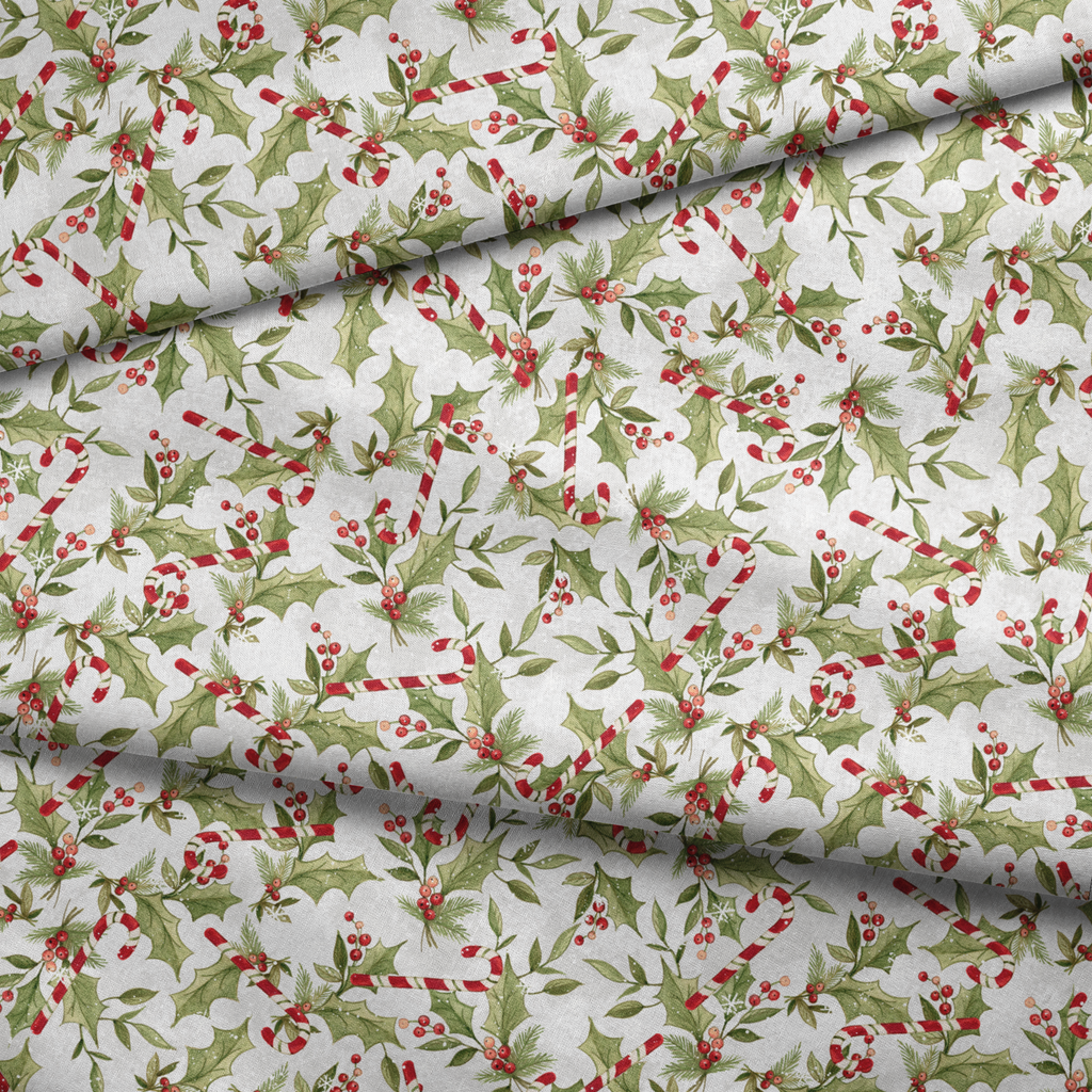 Festive holiday fabric with white background showcasing green holly leaves, berries, and candy cane accents—perfect for Christmas quilting, home decor, or seasonal crafts.