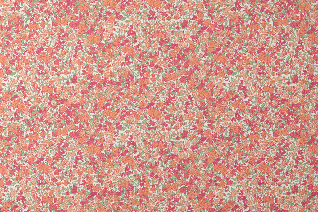 Vibrant abstract floral pattern in coral, pink, and red hues with small scattered blossoms creating a festive, summery aesthetic perfect for elegant home decor.