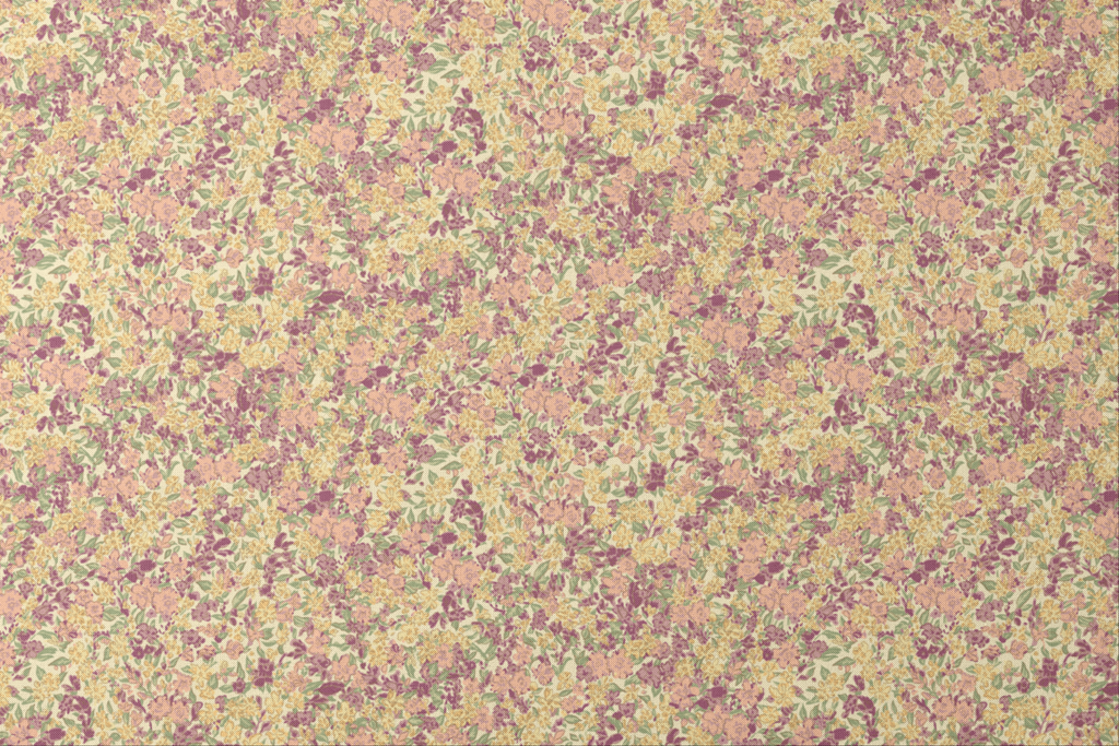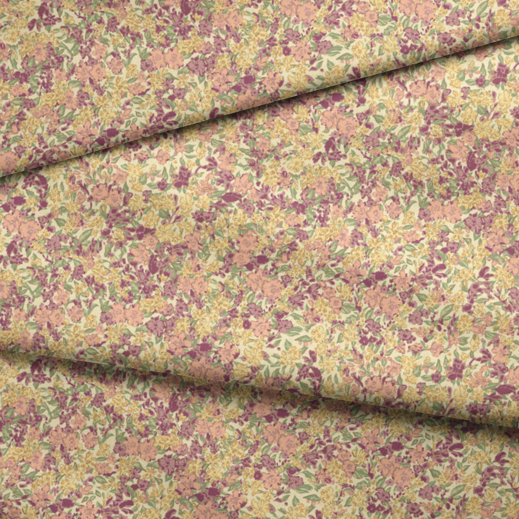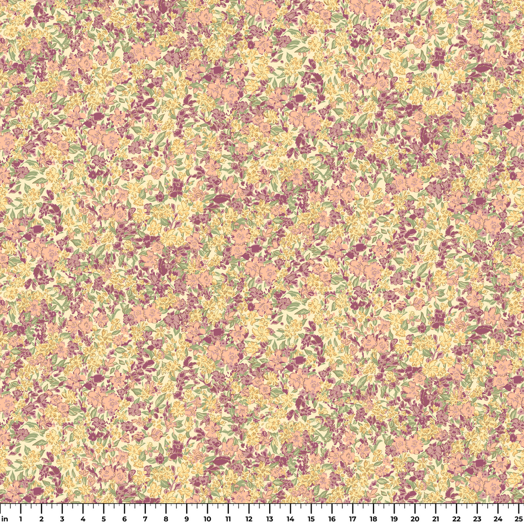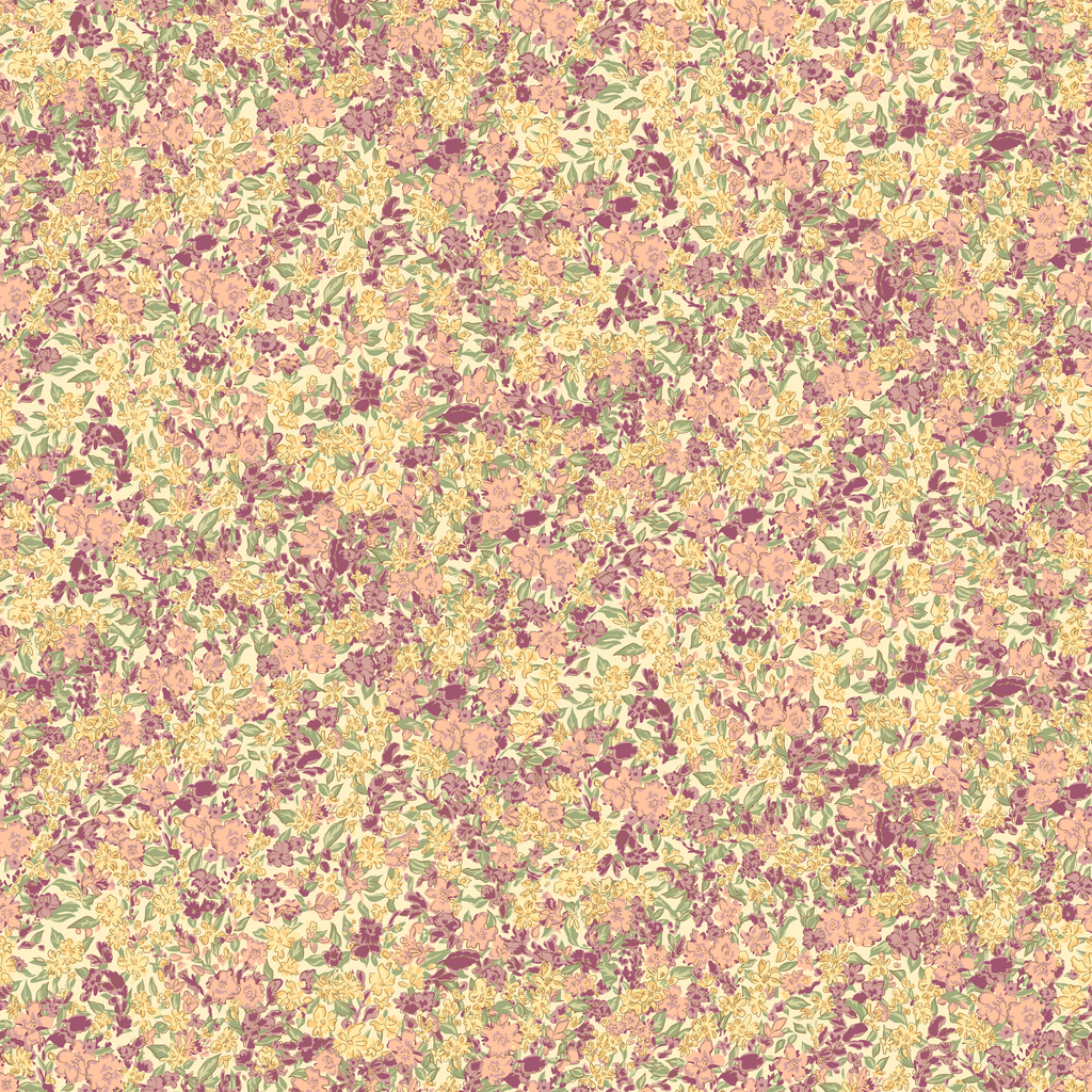 A delicate wildflower meadow blooms across this fabric in a dreamy palette of buttery yellows, soft blush pinks, and rich plum purples against a cream background. Tiny flowers cluster densely together in a vintage-inspired design that captures the whimsical beauty of a spring garden in full bloom. The hand-drawn quality of the floral illustrations gives this fabric a charming, artisanal feel that would bring warmth to quilting projects or romantic cottage-style home décor pieces.