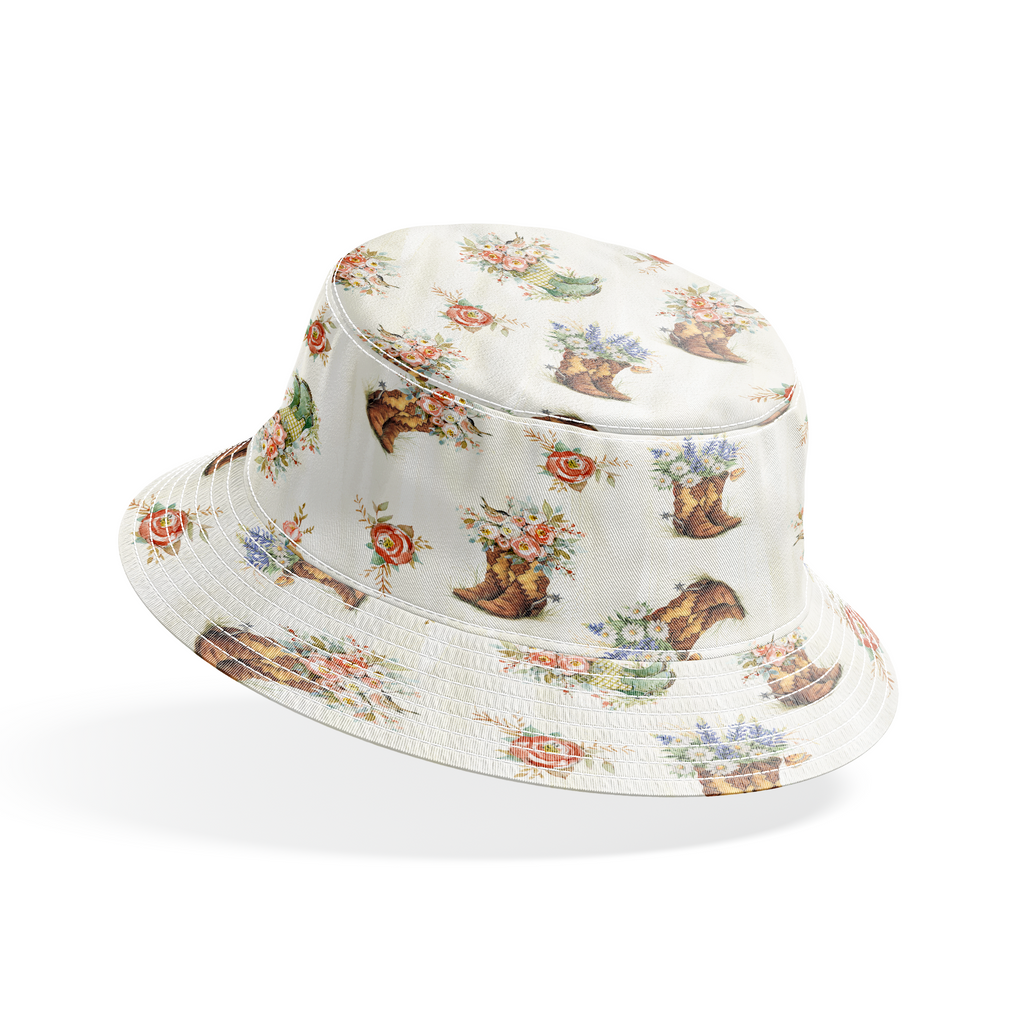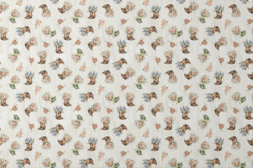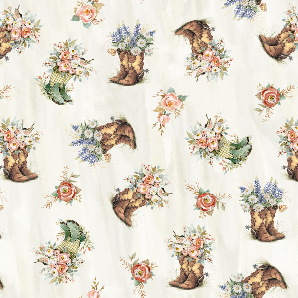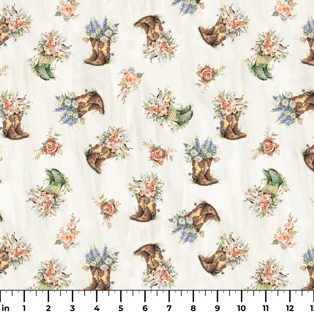 Charming rustic boots overflowing with wildflower bouquets dance across this creamy backdrop. Weathered brown cowboy boots and green rain boots burst with delicate pink roses, white daisies, and sprigs of purple lavender, creating a whimsical country garden feel. Scattered single roses in coral and peach add a lovely rhythm to the pattern. This fabric would be perfect for quilting projects with a farmhouse aesthetic or for crafting charming throw pillows for a country cottage space.