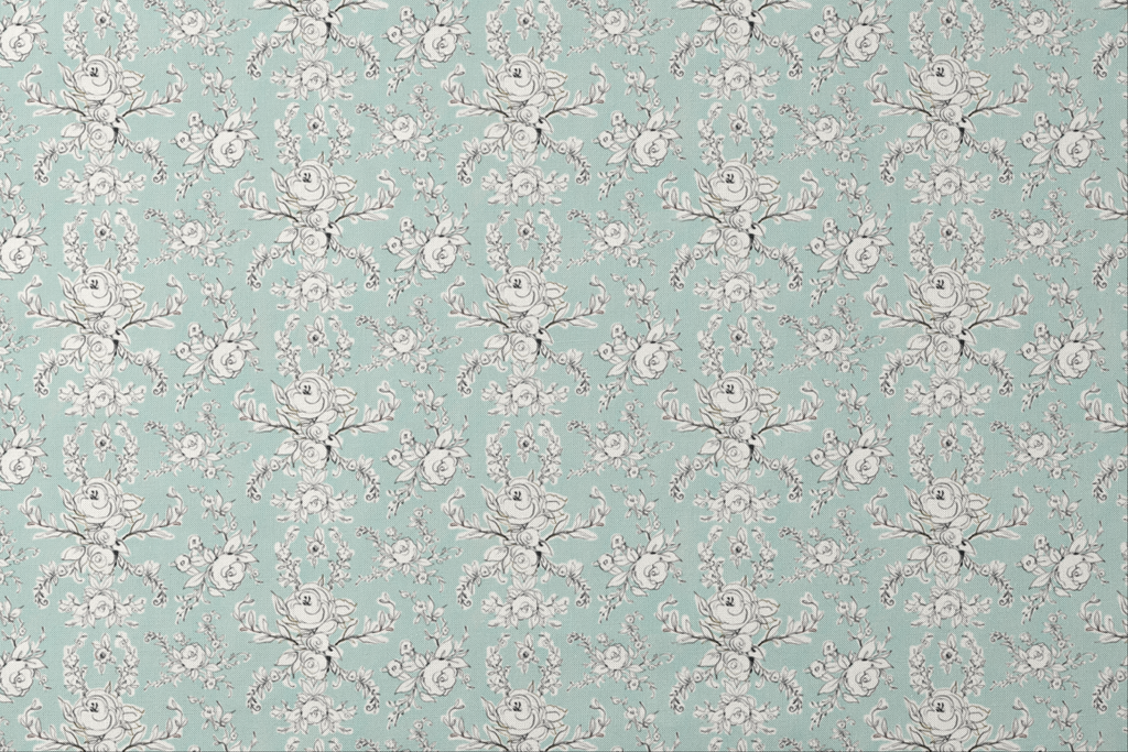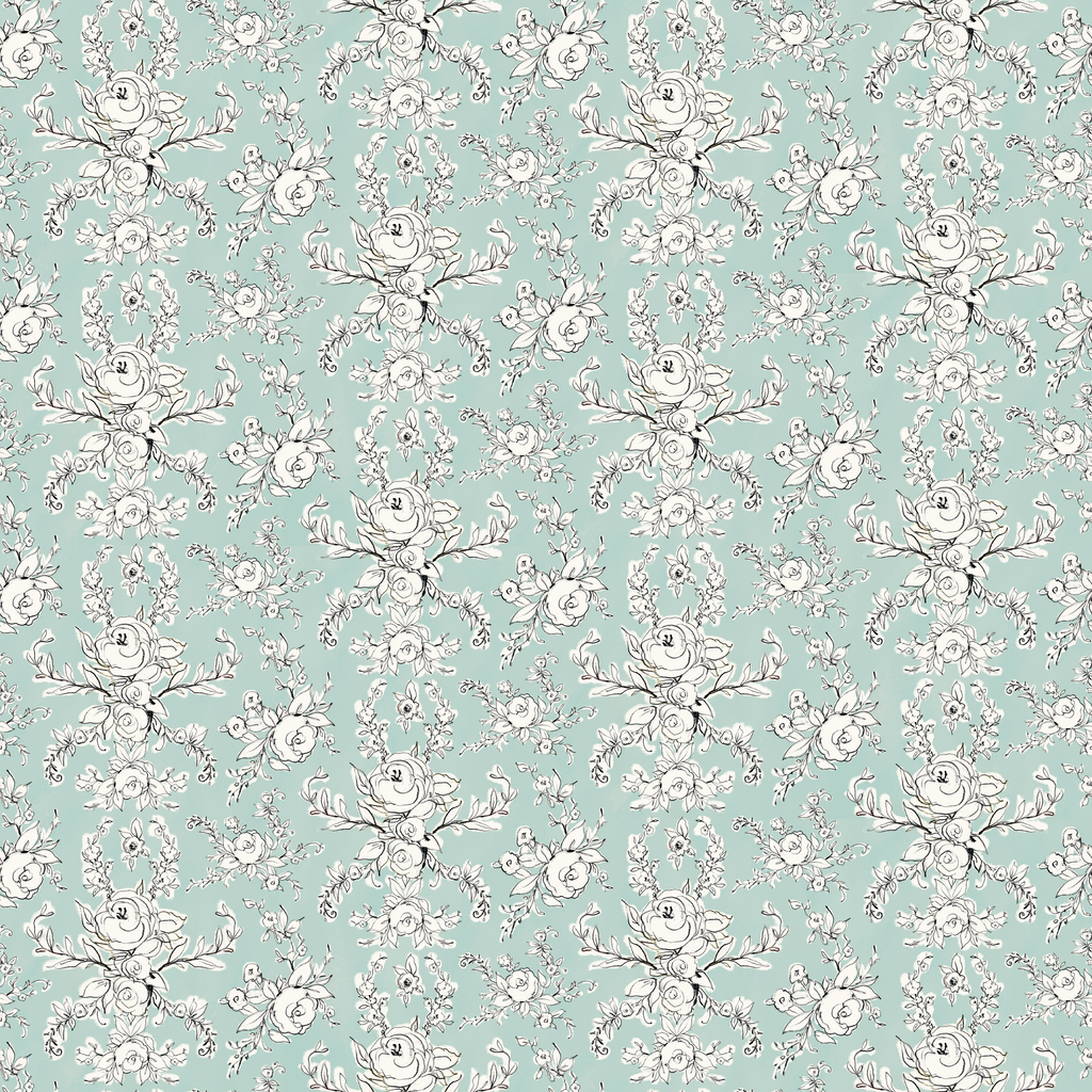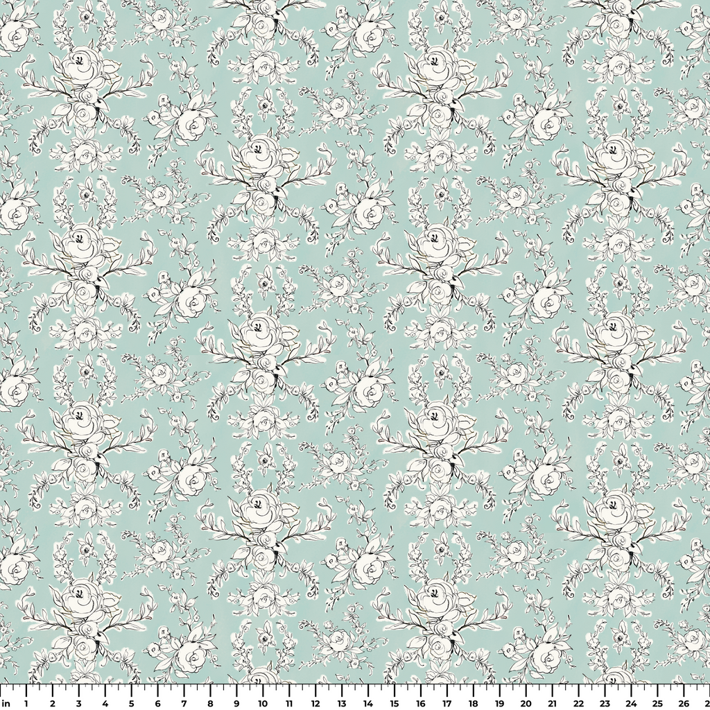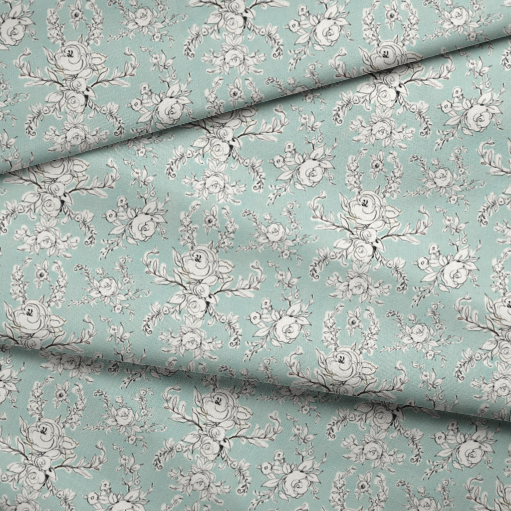 Delicate line-drawn roses and florals dance across a serene mint green background in this elegant botanical pattern. The intricate black and white illustrations have a hand-sketched quality, creating a fresh yet timeless feel with their graceful curves and thoughtfully arranged blooms. This sophisticated fabric would make stunning accent pillows in a sunroom or transform into a charming apron for the garden-loving chef in your life.