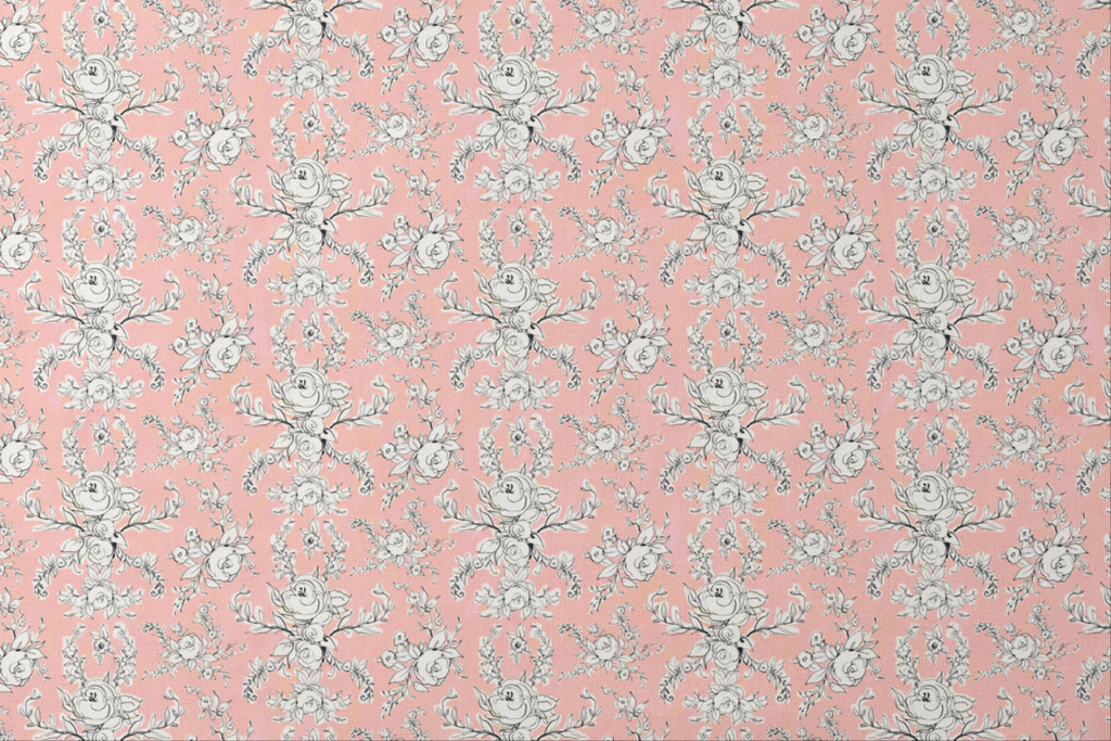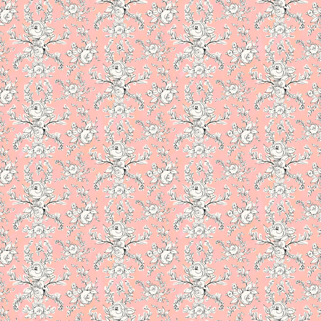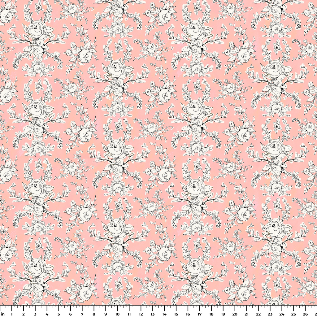 Elegant black and white floral sketches dance across a dreamy coral-pink background in this sophisticated pattern. Delicate roses and intricate botanical motifs create a romantic damask-inspired arrangement with graceful vines and leaves flowing throughout. This charming fabric would make stunning spring dresses or beautiful nursery accents for a touch of vintage-inspired elegance.