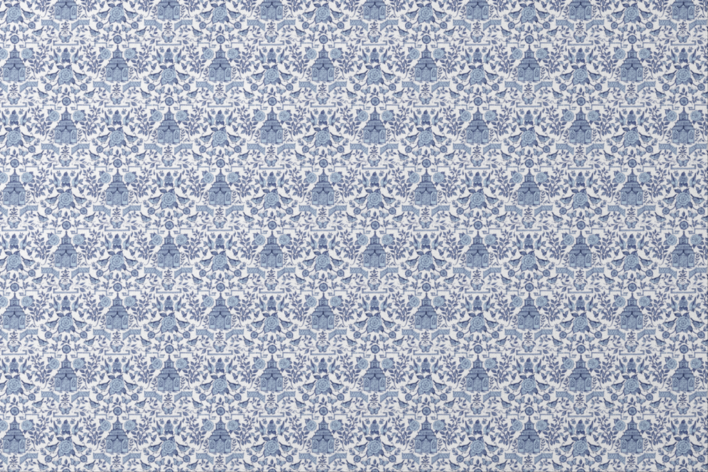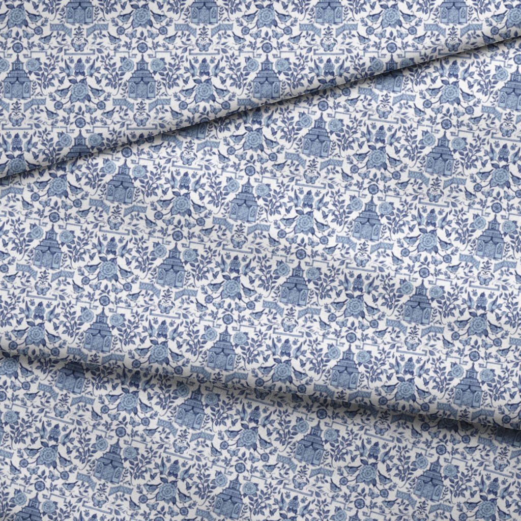 This enchanting Chinoiserie pattern showcases delicate blue and white illustrations of pagodas, fluttering butterflies, and tiny birds nestled among lush blooming flowers. The traditional blue-and-white color scheme gives this fabric a timeless elegance, with varying shades of indigo and powder blue creating depth against the crisp white background. Perfect for crafting elegant throw pillows or creating statement curtains that bring a touch of classic Asian-inspired design to your home.