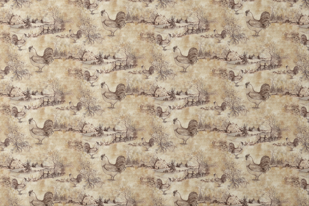 Classic farmhouse toile pattern in earthy tones featuring roosters and country scenes. This vintage-inspired fabric creates a nostalgic, rustic aesthetic perfect for traditional home decor.