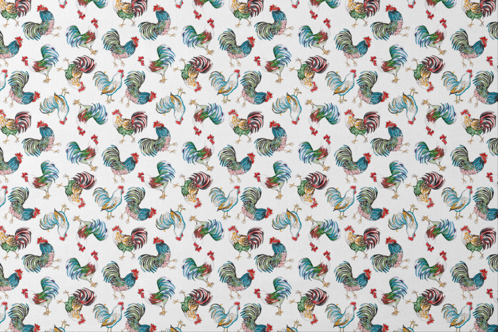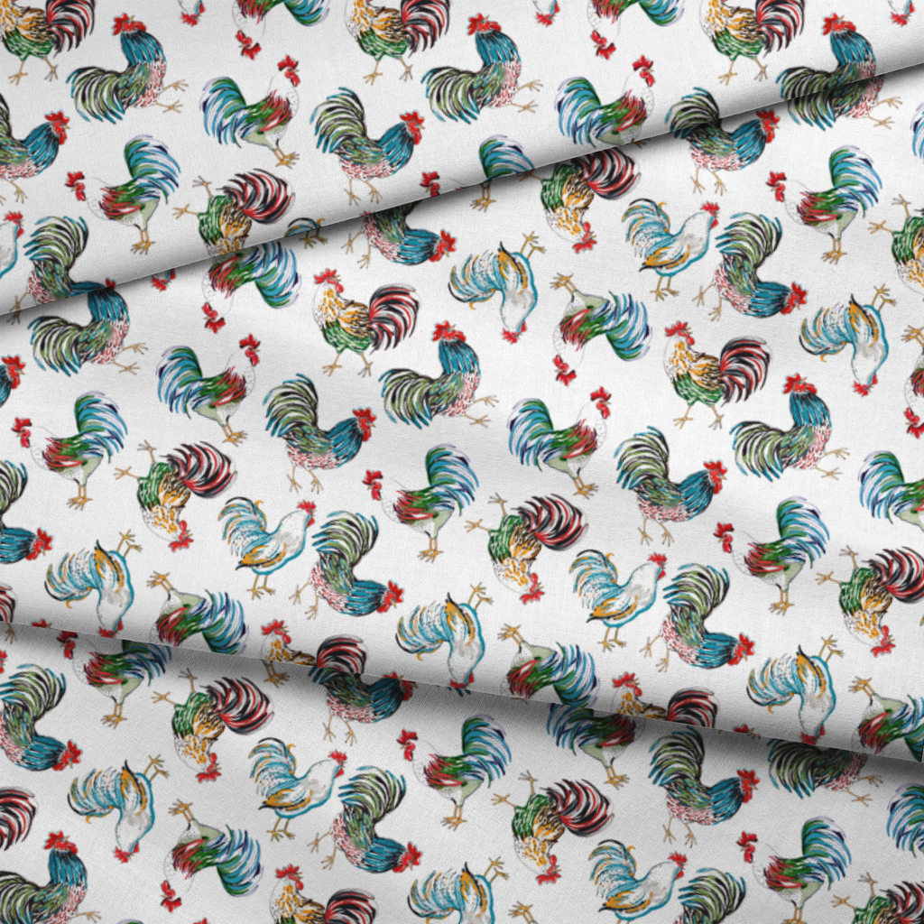 Vibrant roosters strut across this charming watercolor fabric, showcasing a rainbow of blue, green, red, and gold plumage against a crisp white background. Each bird has its own personality, with flowing tail feathers and proud crimson combs giving the pattern a lively, farmhouse feel. Perfect for kitchen accessories like aprons and tea towels, this cheerful print would also make delightful cafe curtains or accent pillows for a country-inspired space.
