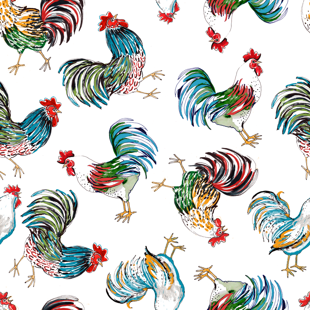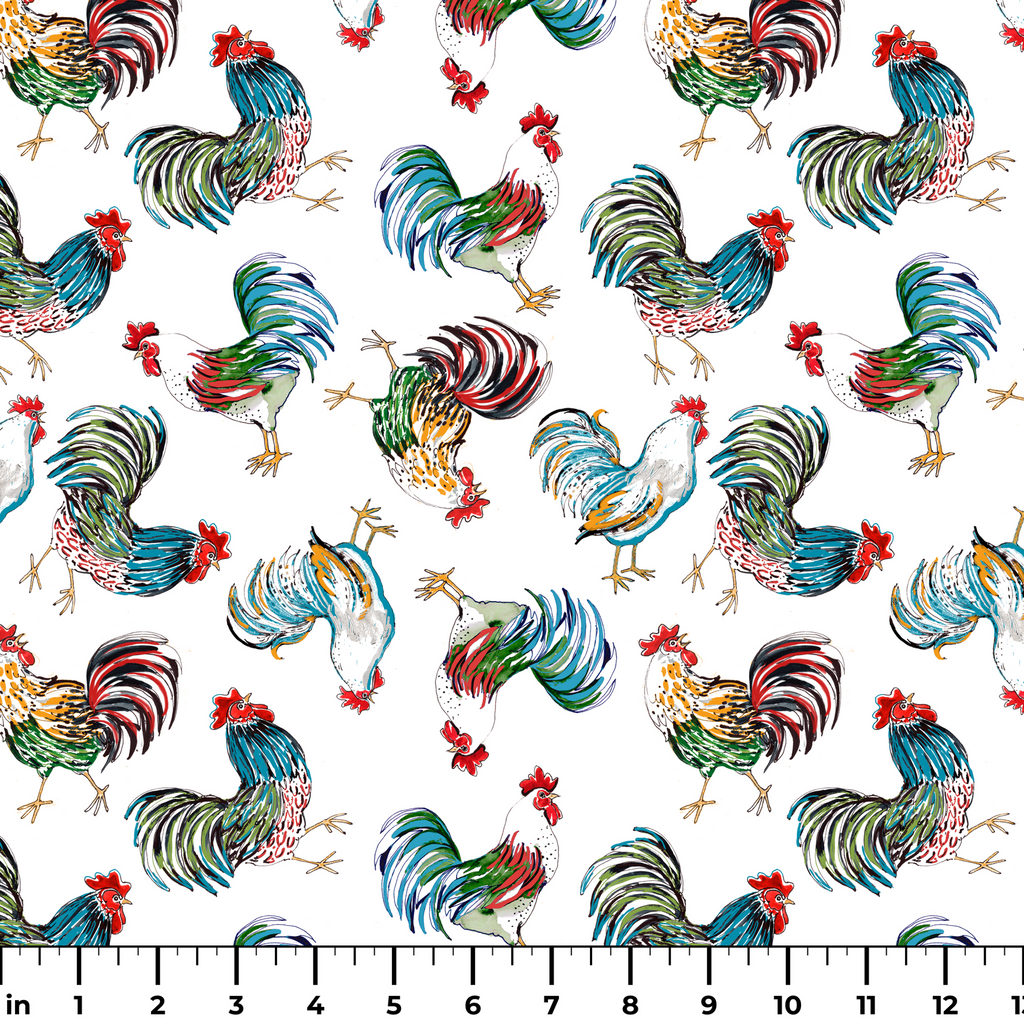 Susan Winget - Farmhouse Strut - Watercolor Roosters White Fabric