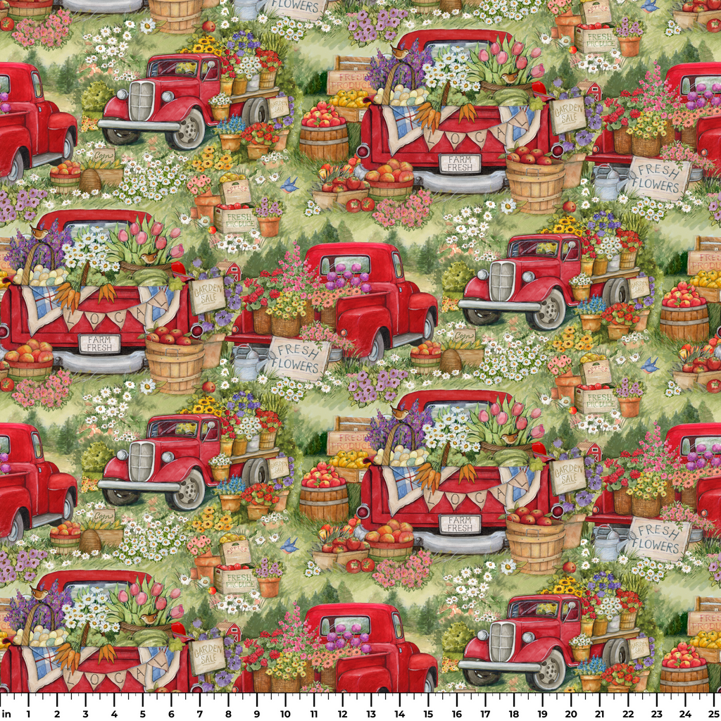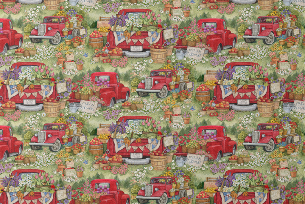 Step into a charming countryside garden with this vibrant fabric featuring vintage red pickup trucks brimming with farm-fresh produce and colorful blooms. Wooden barrels overflowing with apples, carrots, and wildflowers dot the lush green landscape, while cheerful banners and rustic signs proclaiming "Garden Sale" and "Fresh Flowers" complete this nostalgic farm market scene. Perfect for kitchen projects like aprons and tea towels, or use it to create stunning accent pillows that bring a touch of country charm to any space.