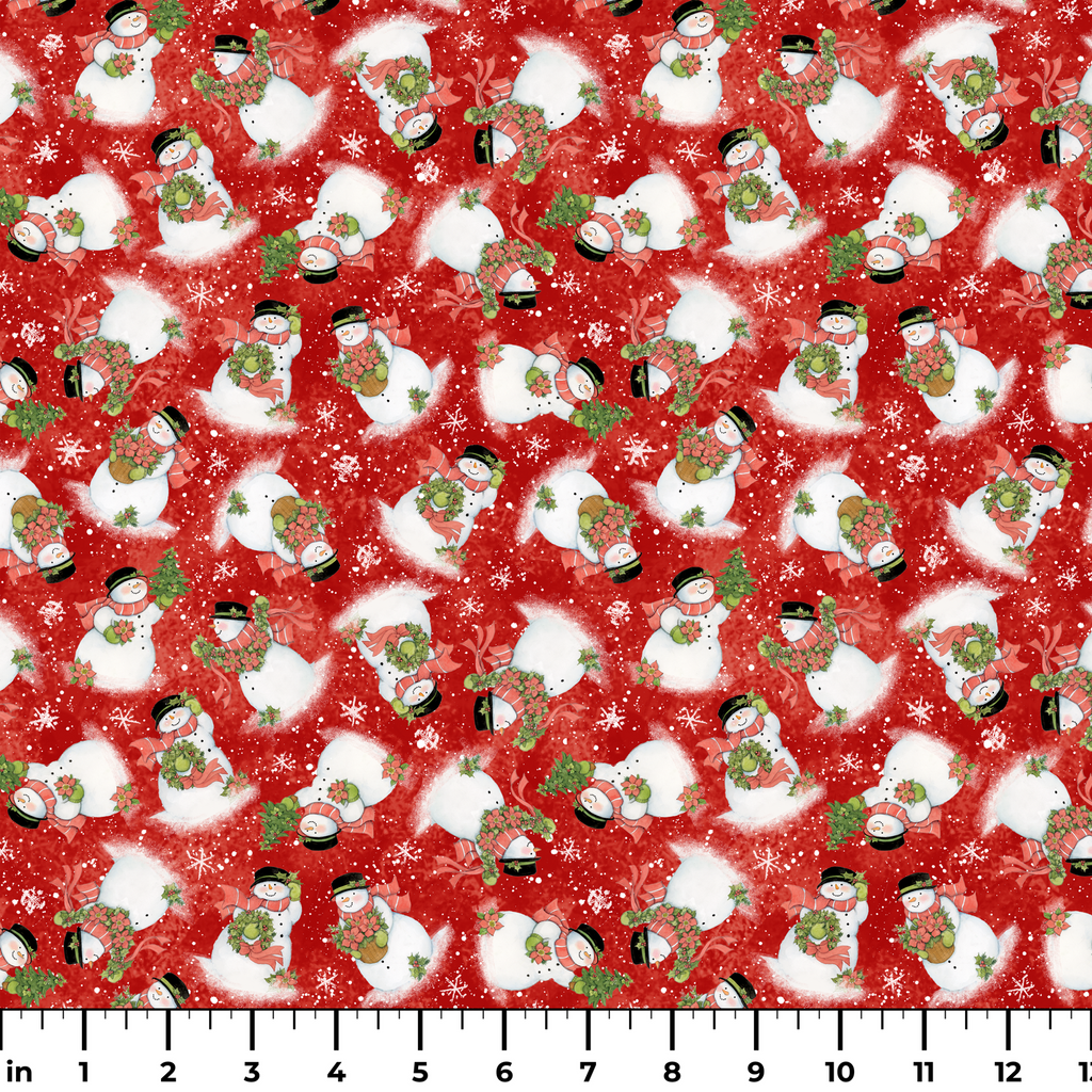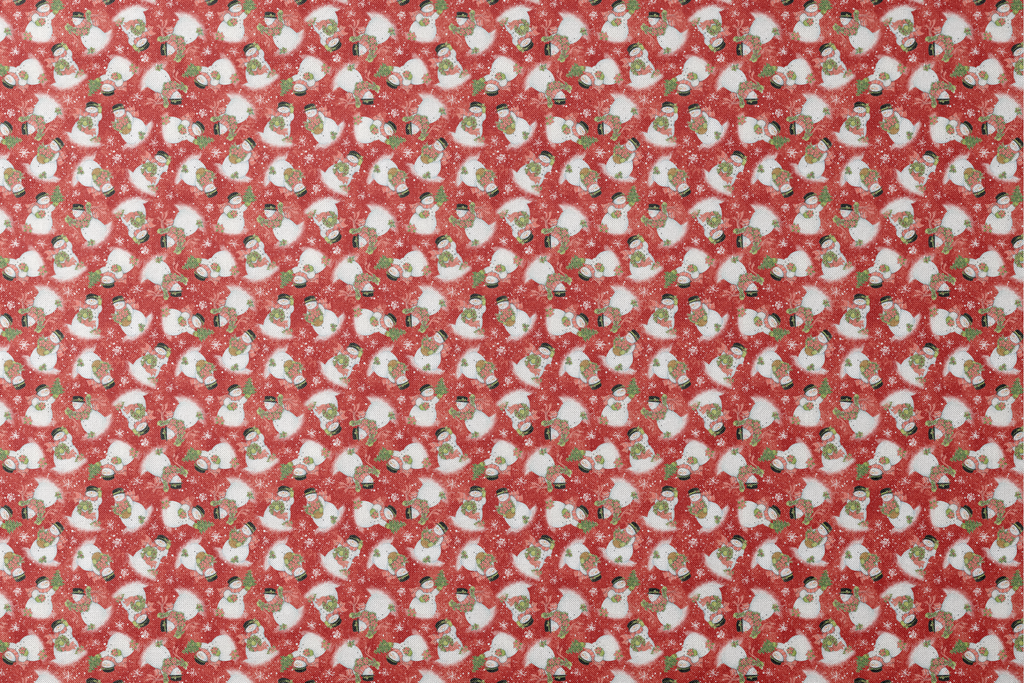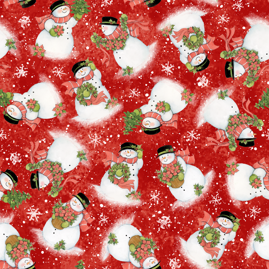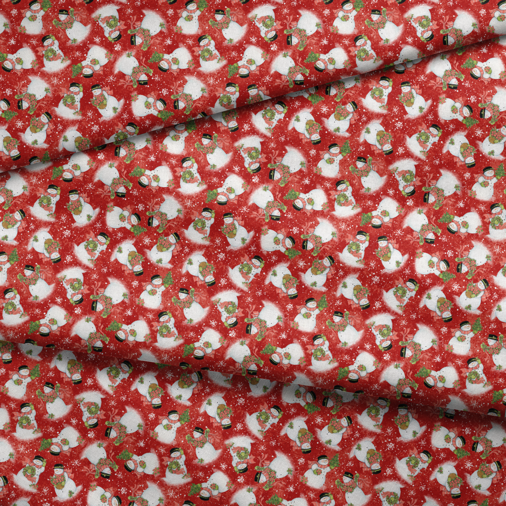 Holiday snowman pattern on vibrant red fabric with white snowflakes, perfect for Christmas holiday decor.