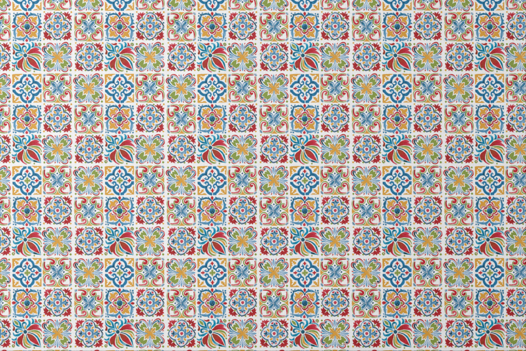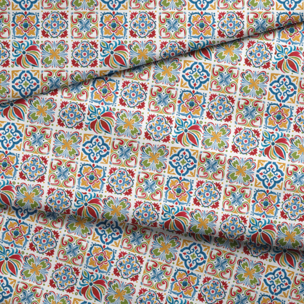 This vibrant tile-inspired pattern bursts with jewel-toned florals and medallions against a crisp white background. Rich cobalt blues, sunny golds, bold reds, and olive greens dance across the fabric in a patchwork of intricate motifs that look hand-painted with watercolor flair. Perfect for summer tablecloths or outdoor cushions, this eye-catching design would also make stunning kitchen curtains that bring a splash of Spanish or Portuguese flavor to your space.