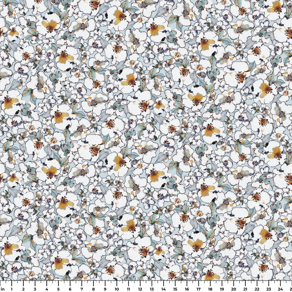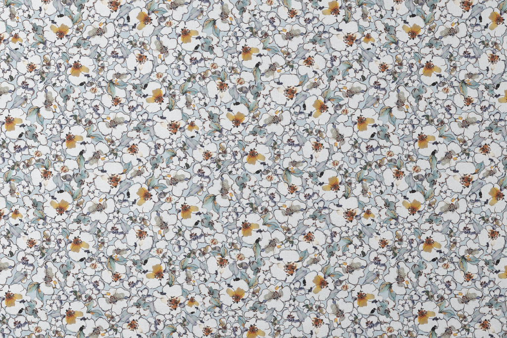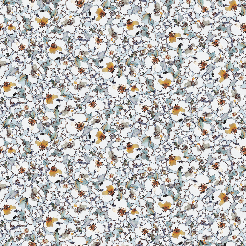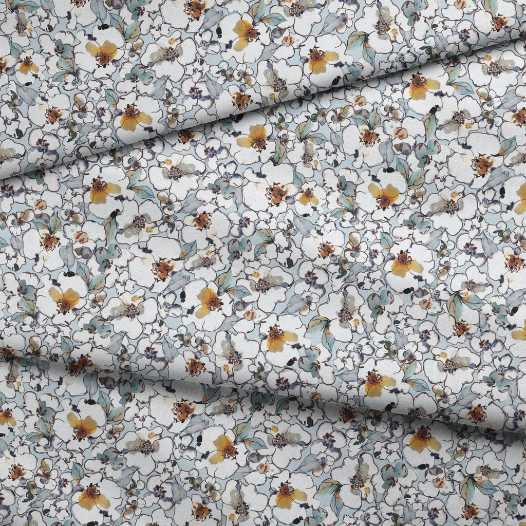 Delicate floral pattern featuring small white blossoms with golden-yellow centers scattered across a light blue background, creating an elegant and versatile design that is perfect for home decor.
