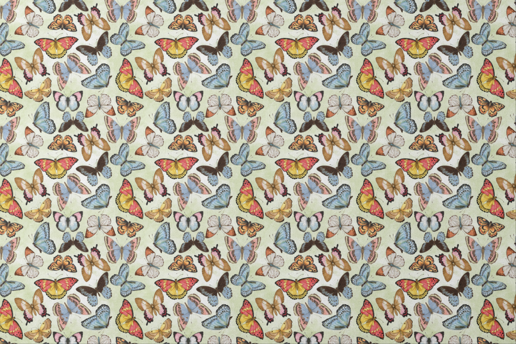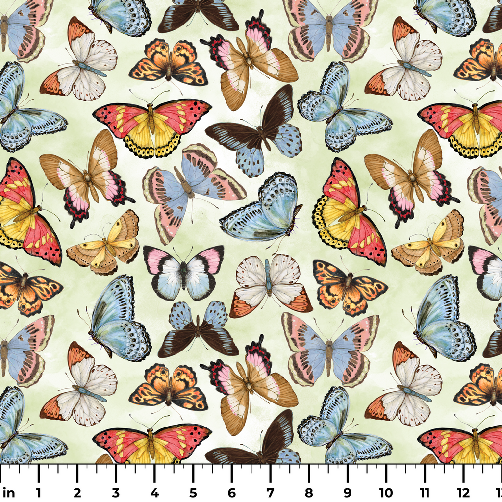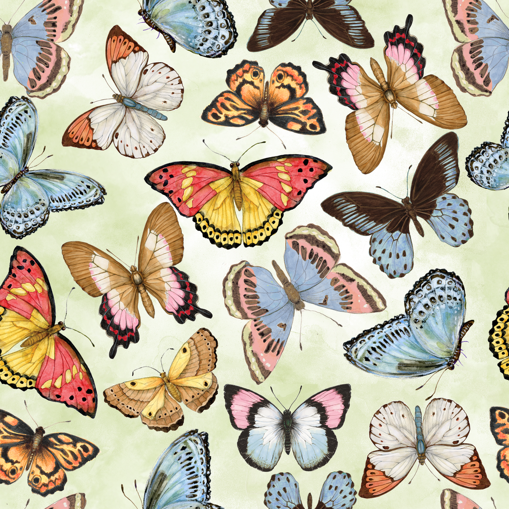 A stunning collection of detailed butterflies dances across a soft mint green background, creating a natural history-inspired pattern. Each butterfly showcases remarkably lifelike details in a palette of coral pinks, powder blues, rich browns, sunshine yellows, and creamy whites. This enchanting fabric would transform a simple summer tote or create breathtaking accent pillows that bring the beauty of a butterfly garden indoors.