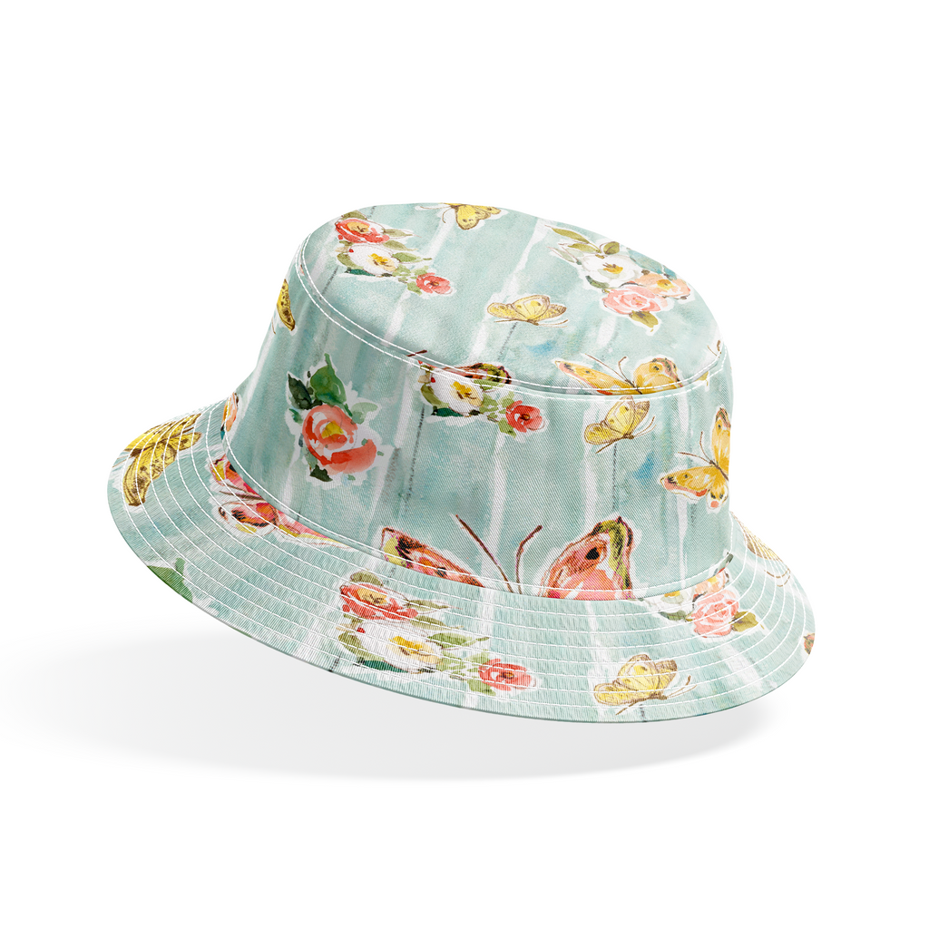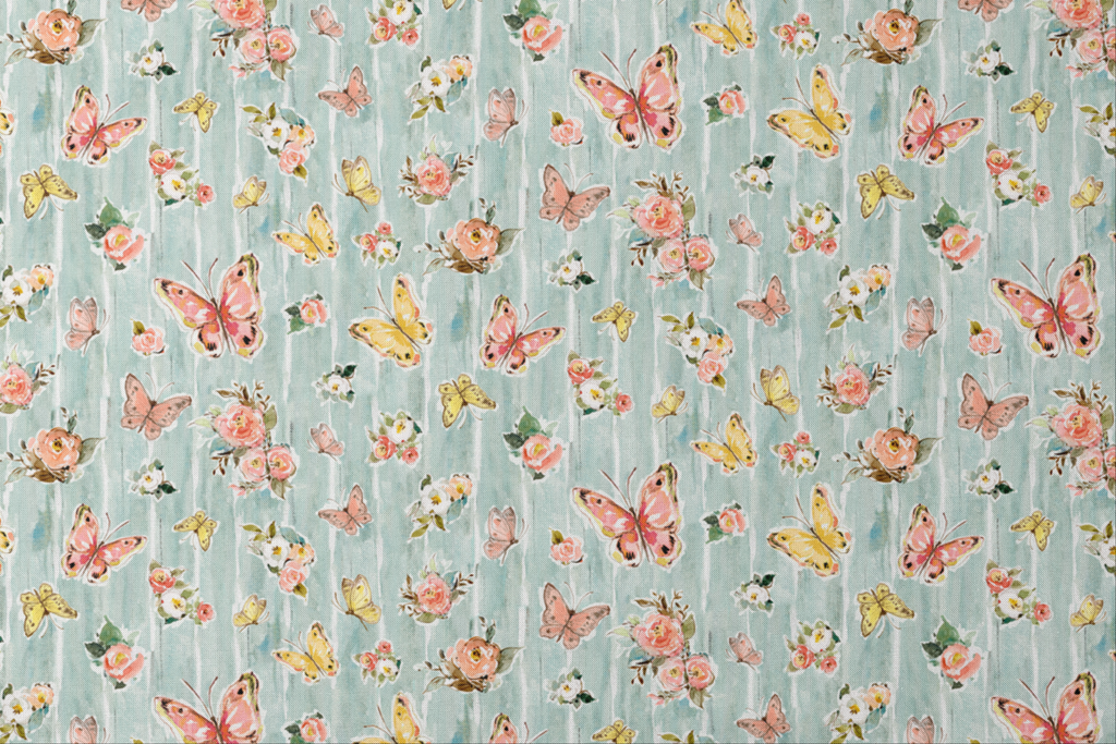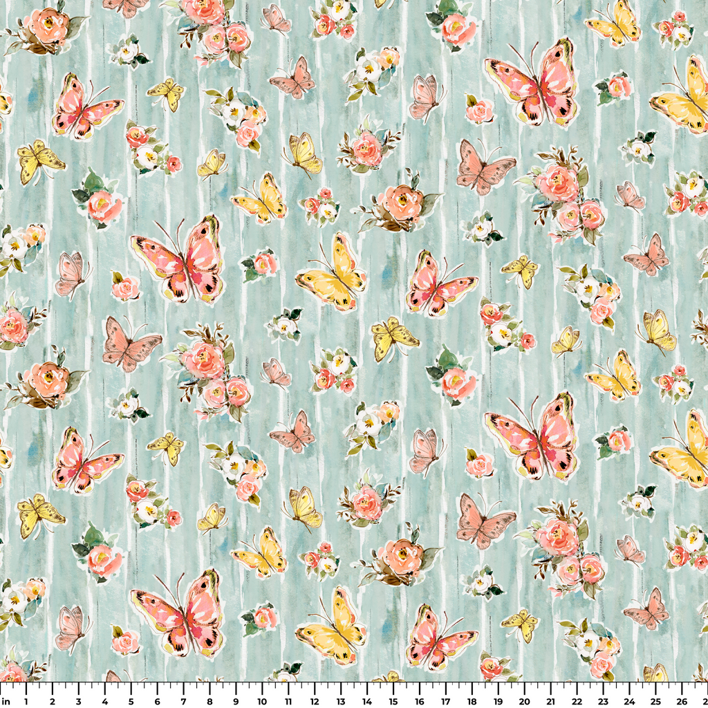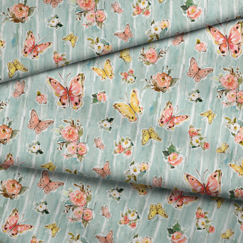 Delicate butterflies in soft coral pink and buttery yellow dance among watercolor roses on a serene sage green background with subtle white striations. The whimsical, painterly style gives this fabric a fresh garden feel, with each butterfly and bloom appearing to float effortlessly across the surface. This enchanting print would be perfect for spring and summer projects like garden party pillows or a lightweight quilted throw that brings the beauty of a cottage garden indoors.
