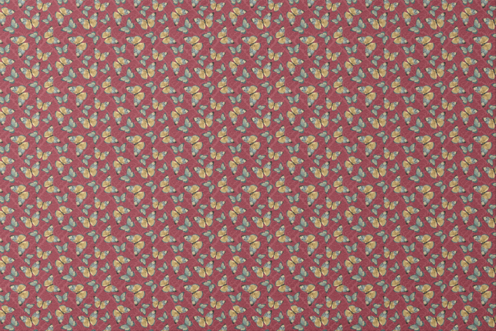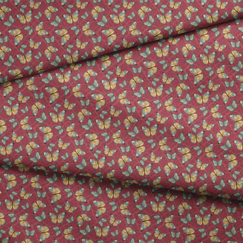 Delicate butterflies in soft butter yellow and misty blue dance across a rich cranberry background adorned with subtle damask motifs. The winged beauties display detailed wings with tiny speckles and dark edging, creating a vintage-inspired yet fresh aesthetic. This enchanting fabric would make stunning accent pillows in a sunroom or transform into a breathtaking quilted wall hanging that captures the fleeting beauty of nature.