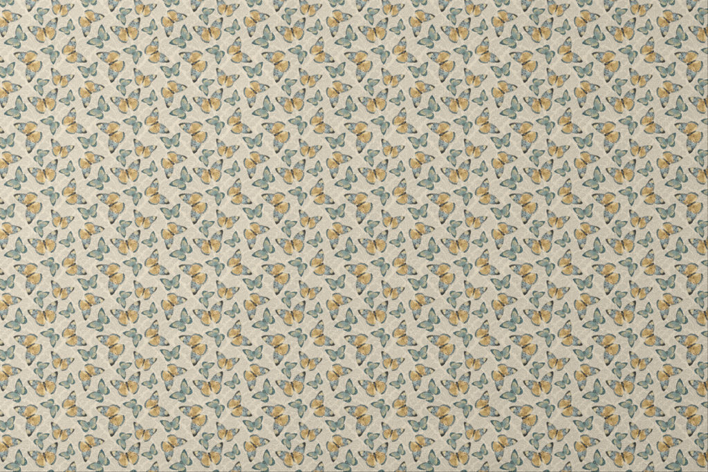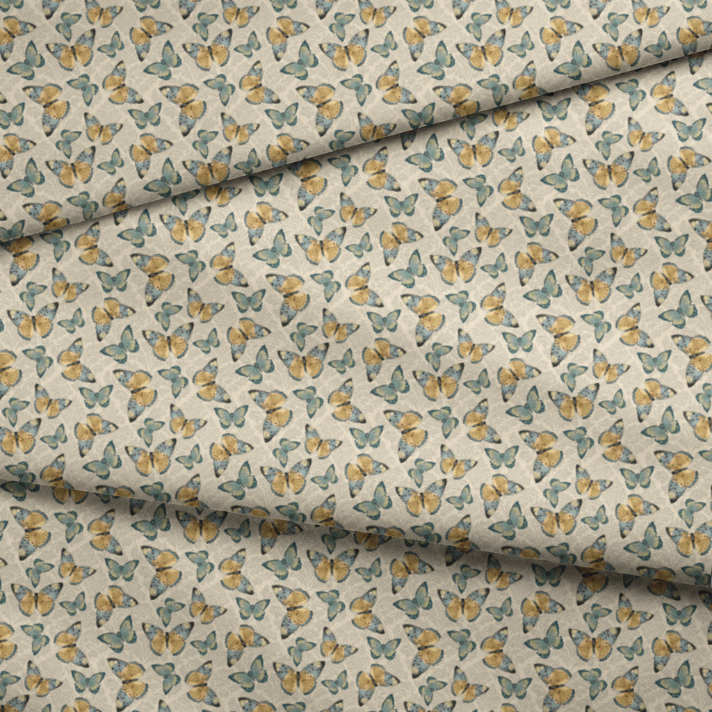 Delicate butterflies in soft butter yellow and teal blue dance across a cream-colored background adorned with subtle damask motifs. Each butterfly's wings feature intricate details with dark navy edging and speckled markings that give them a wonderfully vintage, hand-painted quality. This elegant fabric would make stunning accent pillows for a sunroom or transform a plain window into a statement with butterfly-adorned curtains.