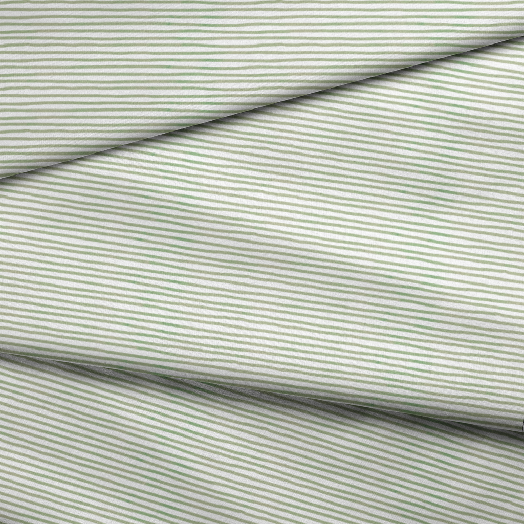 Refreshing green watercolor stripes dance across a crisp white background, creating a hand-painted feel with their subtly uneven edges. The breezy horizontal pattern has a spring-like quality, with the soft green hues reminiscent of new leaves or fresh herbs in a garden. This versatile fabric would make charming kitchen curtains or a lightweight summer tablecloth, bringing a touch of casual elegance to your home.